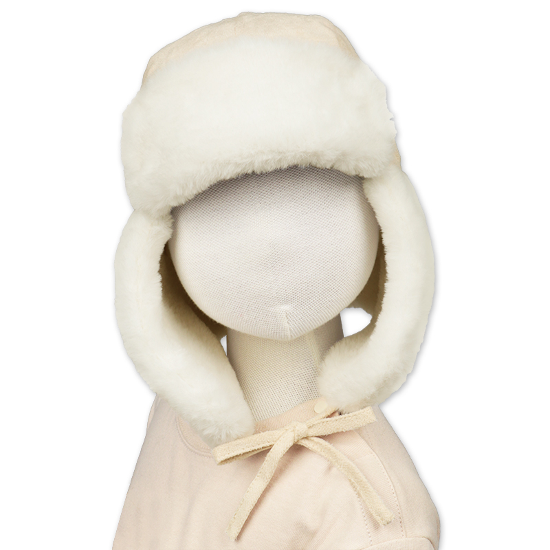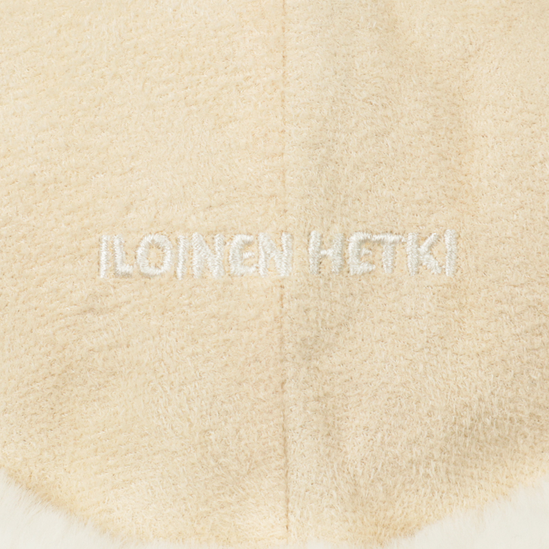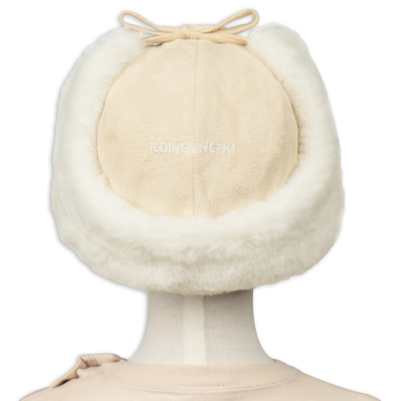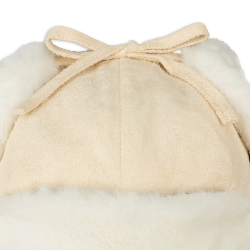 フェイクファーでつくる厚手のフラップ部分が可愛いアイテムです。 やわらかな配色で仕上げています。 フラップ部分は、アップにしたりダウンしたり、仕様を変えられます。 頭のバック部分はロゴ刺繍が飾り、こなれた印象をプラスします。