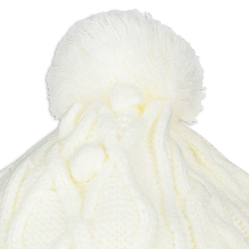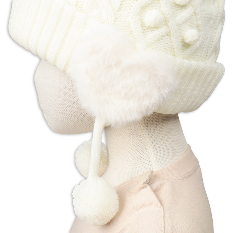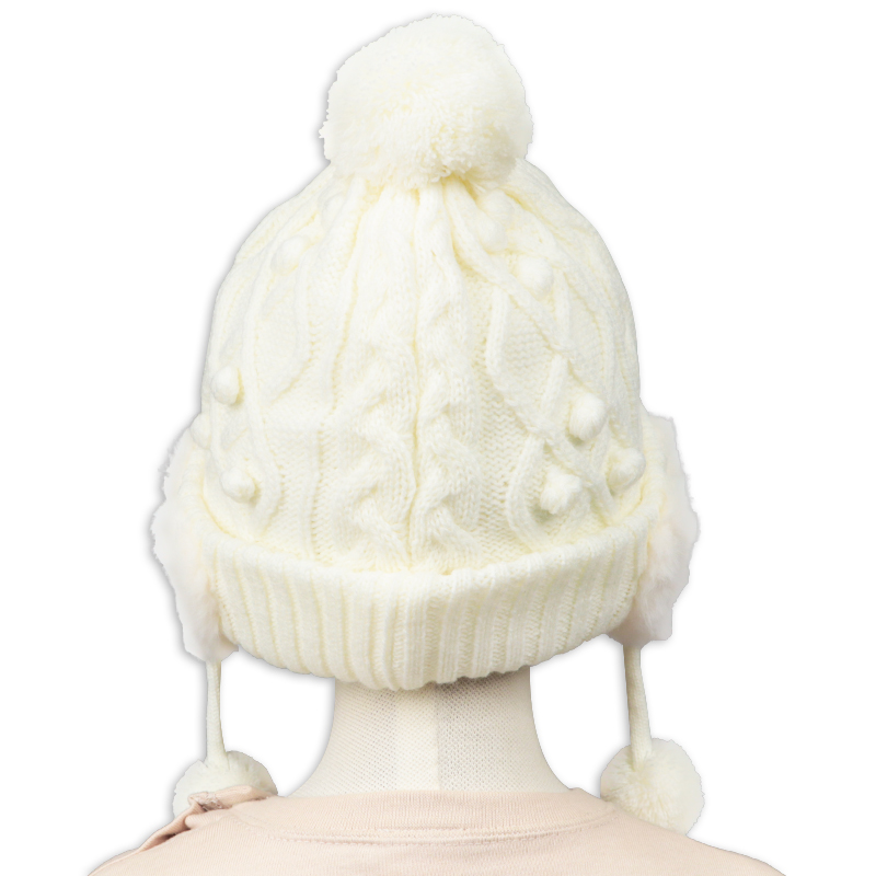 両サイドを飾る、ハートモチーフのふわふわファーが可愛いアイテムです。 ハートモチーフ下で揺れるミニボンボン飾り付き。 本体はふっくらとした、厚みのあるダブル地仕様のニットです。 ケーブル編みには、玉飾りが添えられ、表情のアクセントを楽しめます。