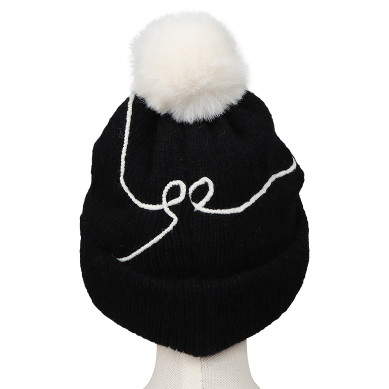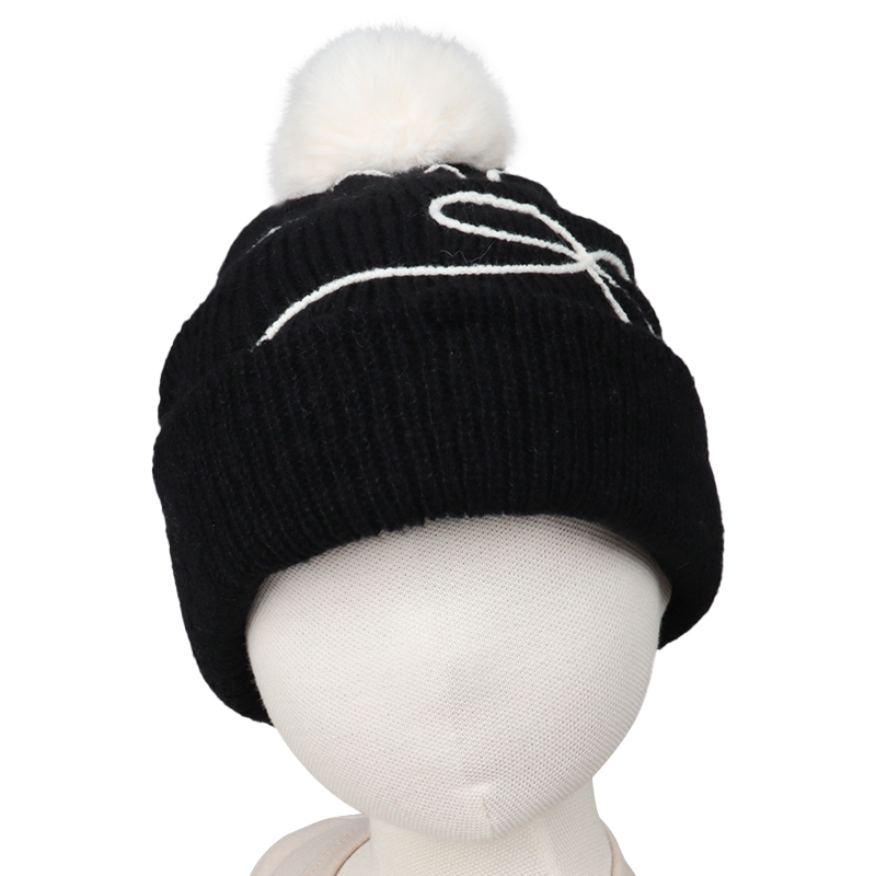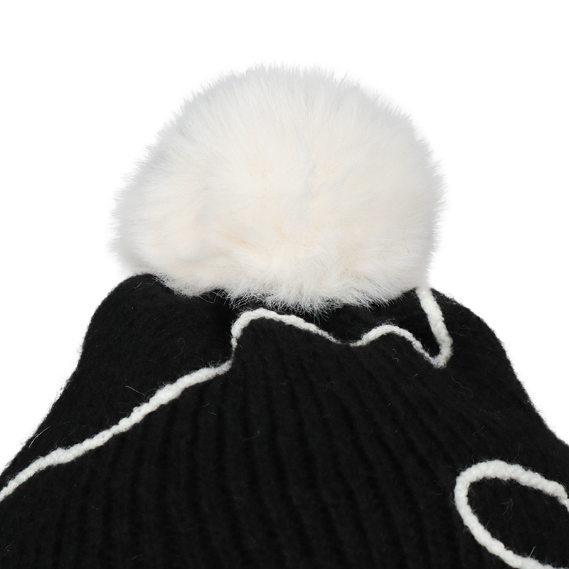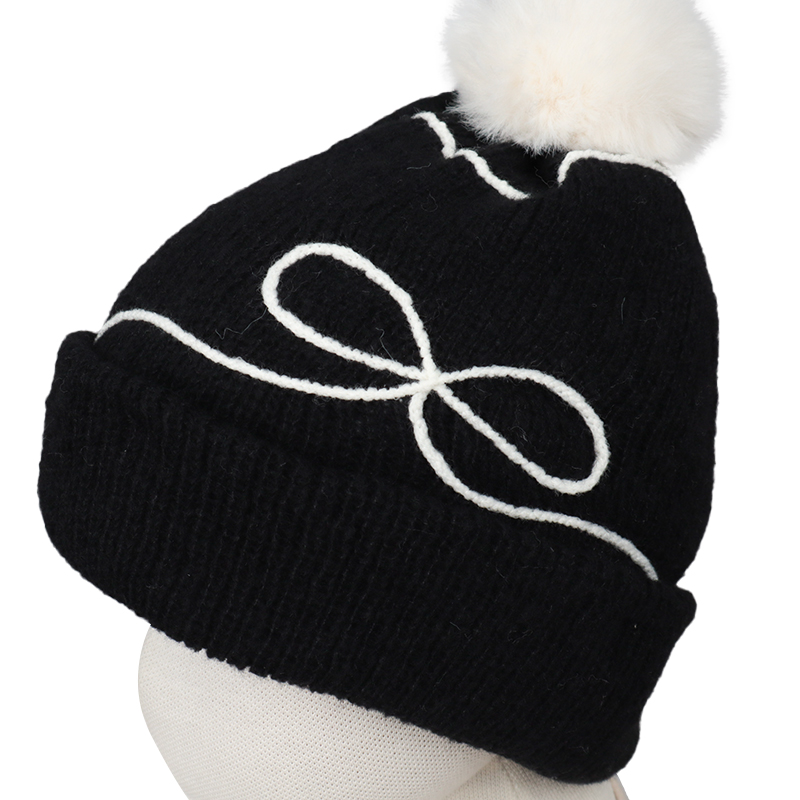 ふっくらとした、厚みのあるダブル地仕様のニットアイテムです。 落ち着いたモノトーン配色でシックに仕上がります。 コードの丸みのあるライン模様が可愛らしい。 ボンボンにはファー素材を取り入れて、華やかな表情もプラス。