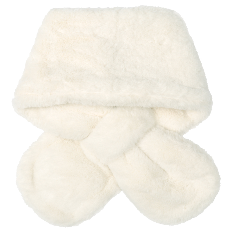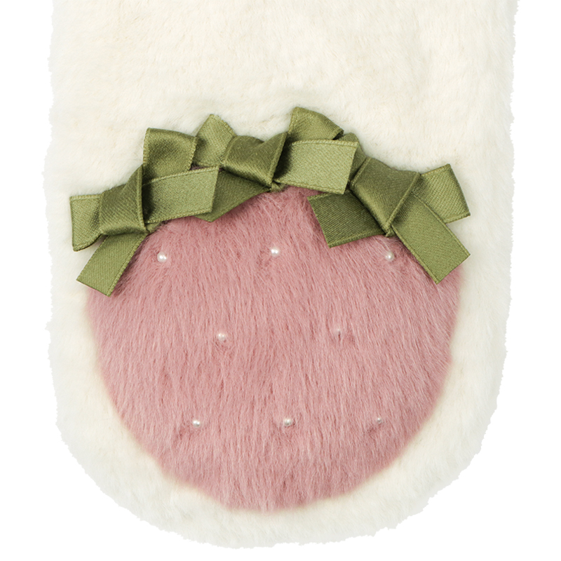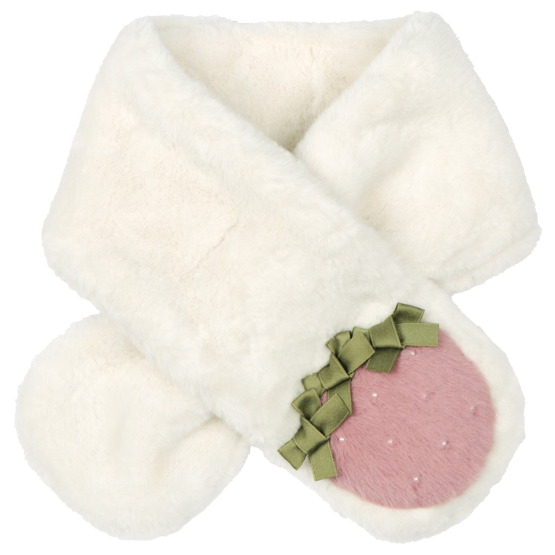 ふわふわフェイクファーで仕上げた、ガーリーテイストのアイテムです。 いちごをモチーフにしたリボン付き飾りがチャームポイント。 華やかに可愛くコーディネートできます。 装着の際は、マフラー部分を、裏側にある帯状のループへ通して使用します。