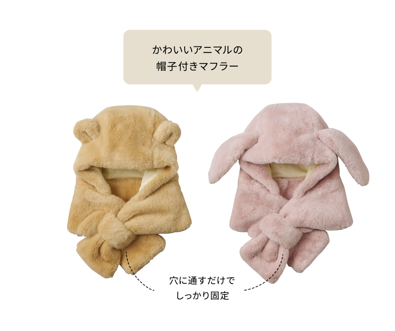 ボリュームのある風合いが可愛らしい、アニマルモチーフのアイテムです。 ふわふわフェイクファーが華やかに映えます。 フード付き仕様なので、首元だけでなく顔まわりもすっぽりと暖かく包み込みます。 装着の際は、マフラー部分を、帯状のループへ通して使用します。