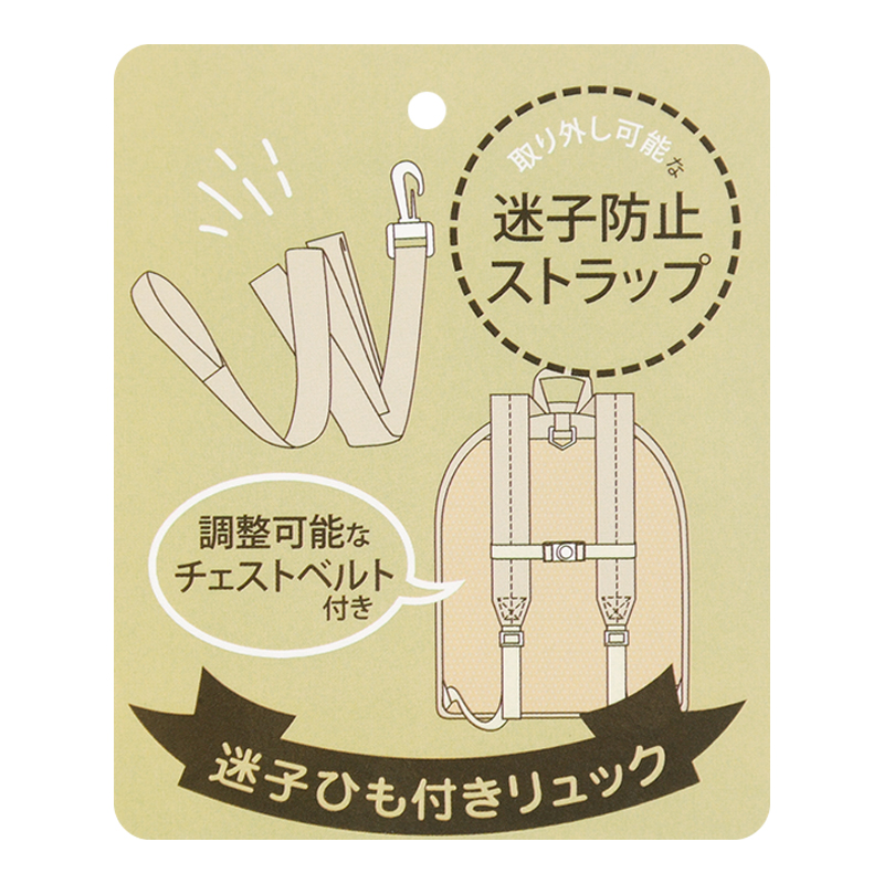 ●素材:ポリエステル100% ●サイズ(約・cm):横幅18 × 高さ20 ×奥行10 ×迷子ひもの長さ90 ●本来の目的以外に使用しないでください ●小さな付属品などは誤って飲み込まないよう注意してください ●迷子ひも部分が首などに巻きつかないようご注意ください