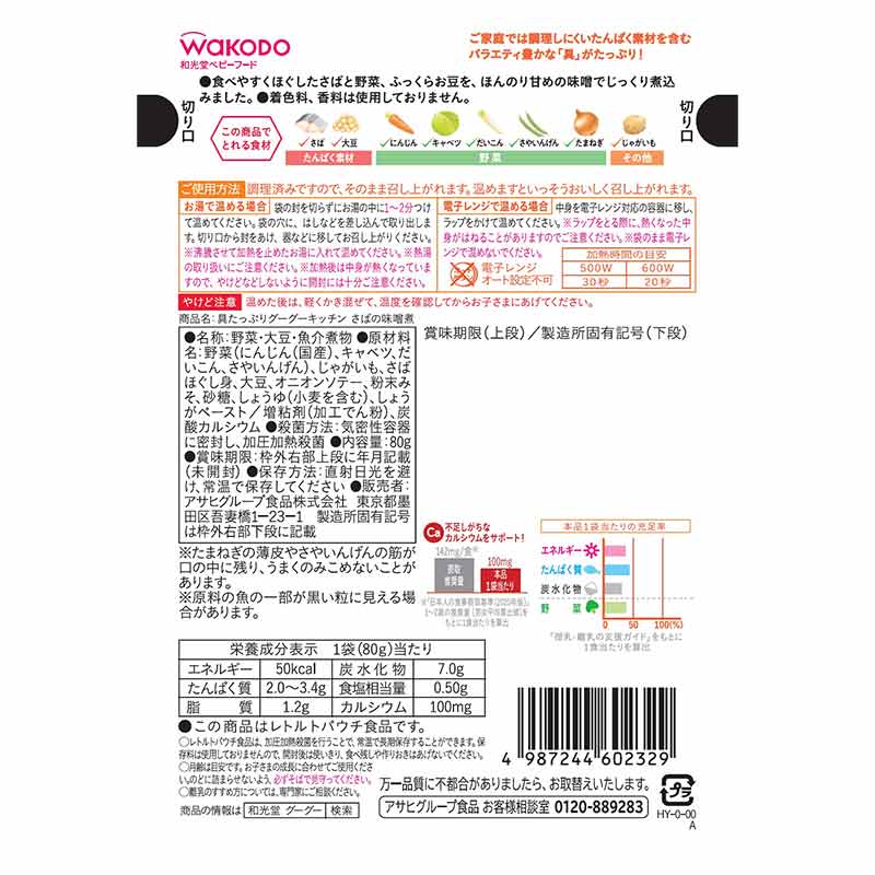 ●原材料名:野菜(にんじん(国産)、キャベツ、だいこん、さやいんげん)、じゃがいも、さばほぐし身、大豆、オニオンソテー、粉末みそ、砂糖、しょうゆ(小麦を含む)、しょうがペースト/増粘剤(加工でん粉)、炭酸カルシウム ●内容量:80g×12個 ●栄養成分表示:単位重量1袋(80g)当たり エネルギー:50kcal、たんぱく質:2.0~3.4g、脂質:1.2g、炭水化物:7.0g、食塩相当量:0.50g、カルシウム:100mg ●原材料に含まれるアレルギー物質(28品目中):小麦、さば、大豆 ●使用開始月齢:12ヵ月頃から