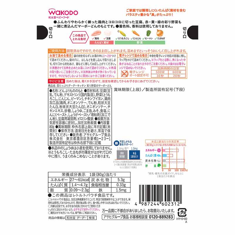 ●原材料名:豆腐(豆乳、でん粉、デキストリン)(国内製造)、野菜(とうもろこし、にんじん、ピーマン)、チキンブイヨン、鶏肉加工品(鶏肉、オニオンソテー、でん粉、粒状大豆たん白、粉末状大豆たん白)、オニオンソテー、チキンエキス、砂糖、しょうゆ、ごま油、みそ、食塩、にんにくペースト、しょうがペースト/増粘剤(加工でん粉)、豆腐用凝固剤、ピロリン酸鉄 ●内容量:80g×12個 ●栄養成分表示:単位重量1袋(80g)当たり エネルギー:27~61kcal、たんぱく質:1.4~4.7g、脂質:0.09~2.3g、炭水化物:5.3g、食塩相当量:0.33g、鉄:1.5mg ●原材料に含まれるアレルギー物質(28品目中):ごま、大豆、鶏肉 ●使用開始月齢:12ヵ月頃から