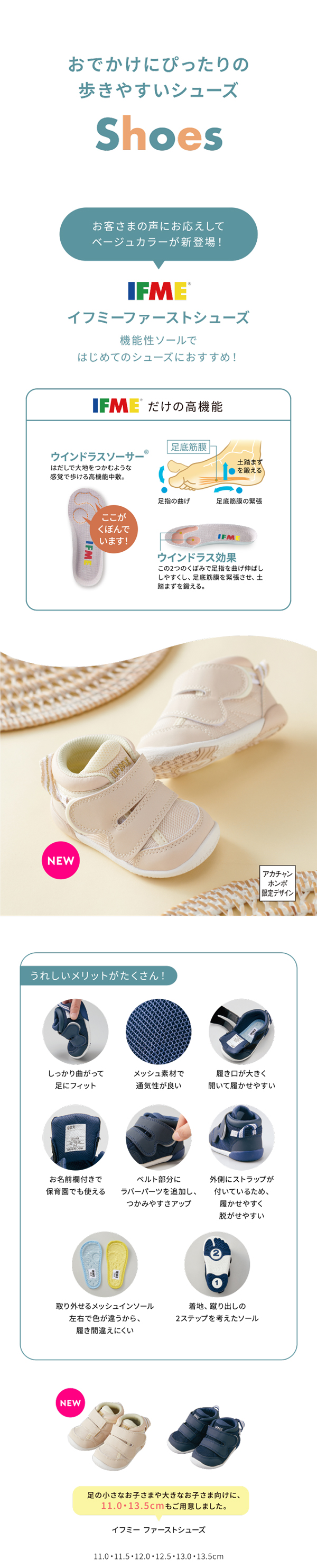 イフミーオリジナルメッシュファーストシューズ。甲材料は通気性のあるメッシュ素材を使用。ワンベルト、ミドルカットタイプ、メッシュインソール仕様。