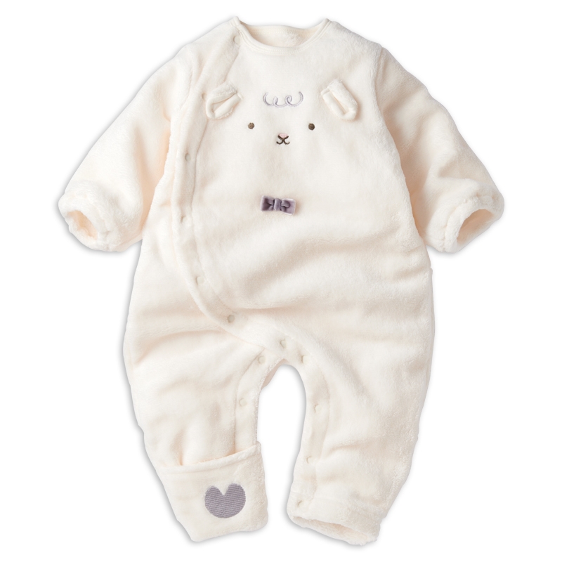 ふわふわなぬいぐるみのようなボアのプレオールです。 足口のミトンをくるっとすると、足先まですっぽり隠れるので靴下をすぐに取ってしまう赤ちゃんの足を危険や寒さから守ります。 股部分は色付きホックでとめ間違え防止になっています。 サイズアウトしたらぬいるぐみに作り直して思い出を残せます。