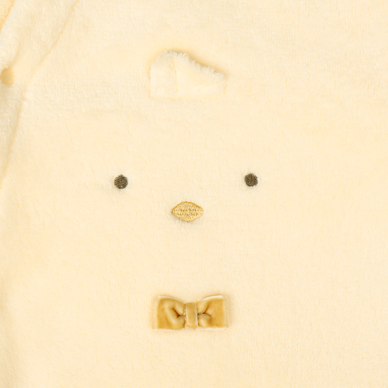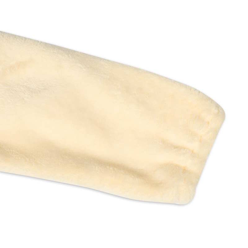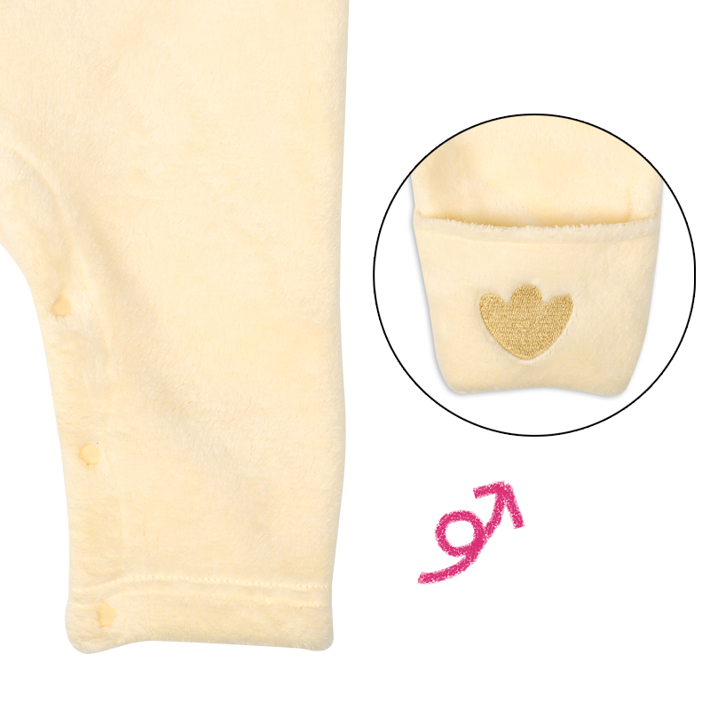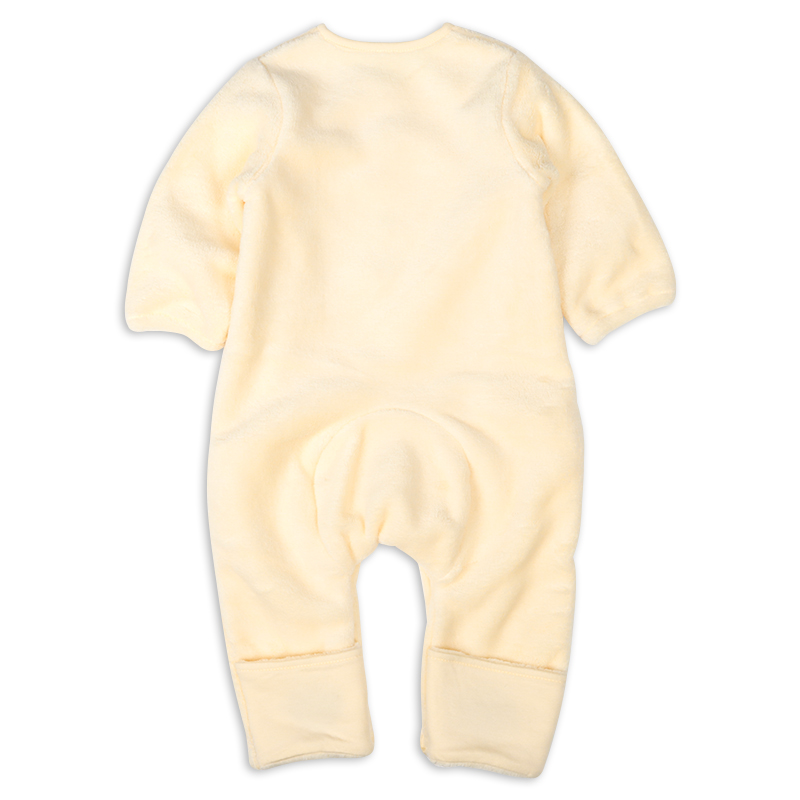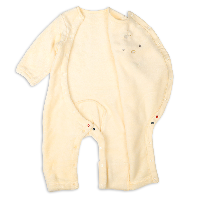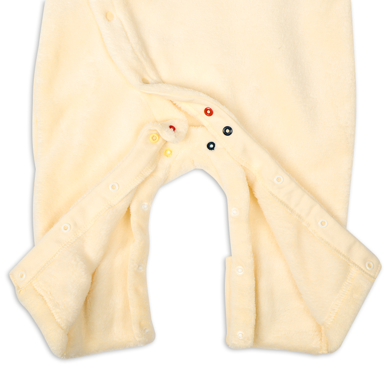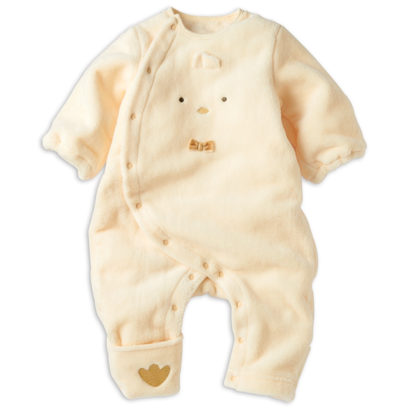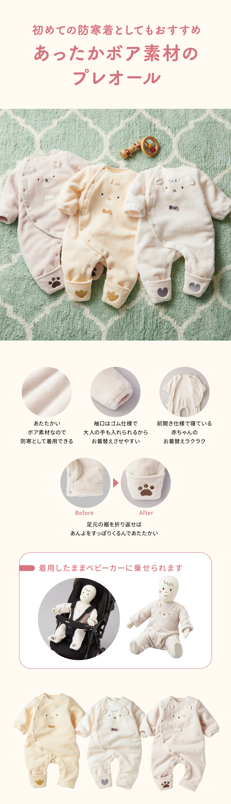 ふわふわなぬいぐるみのようなボアのプレオールです。 足口のミトンをくるっとすると、足先まですっぽり隠れるので靴下をすぐに取ってしまう赤ちゃんの足を危険や寒さから守ります。 股部分は色付きホックでとめ間違え防止になっています。 サイズアウトしたらぬいるぐみに作り直して思い出を残せます。