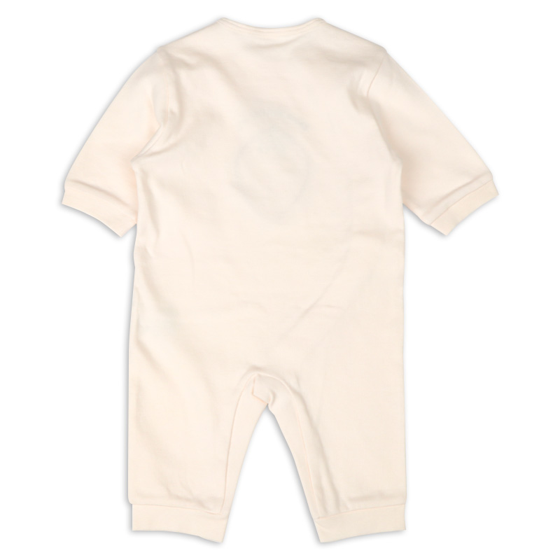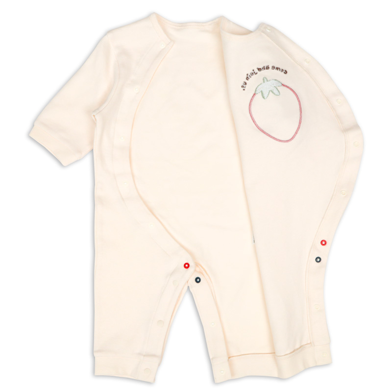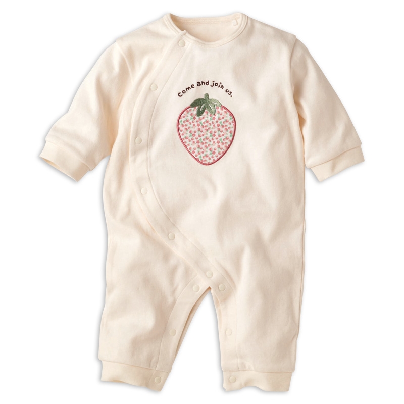 前見頃のアップリケが立体のかわいいプレオールです。 身頃部分は綿100%の生地を使用しております。 ボタン部分は付け間違い防止の為に股部分が配色になっております。 カラーも可愛く、毎日でも着たくなる1着です。