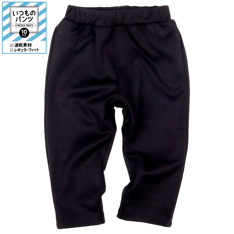 動きやすいストレッチ素材のパンツで、後ろポケット1つ・シンプルなデザイン・ネーム付き、速乾性で園生活にも最適な元気なお子さん向けアイテムです。