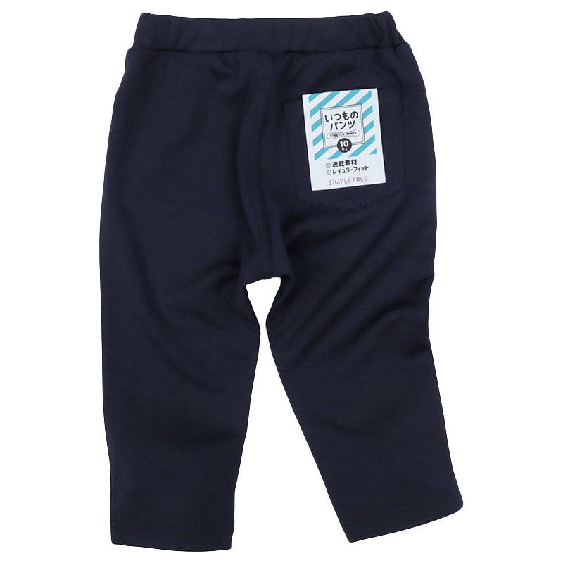 動きやすいストレッチ素材のパンツで、後ろポケット1つ・シンプルなデザイン・ネーム付き、速乾性で園生活にも最適な元気なお子さん向けアイテムです。