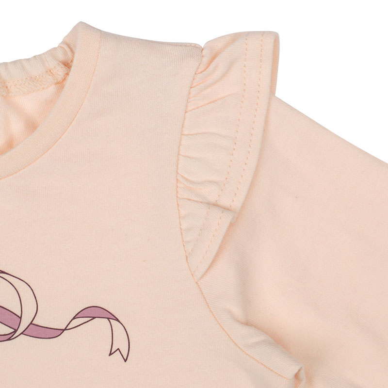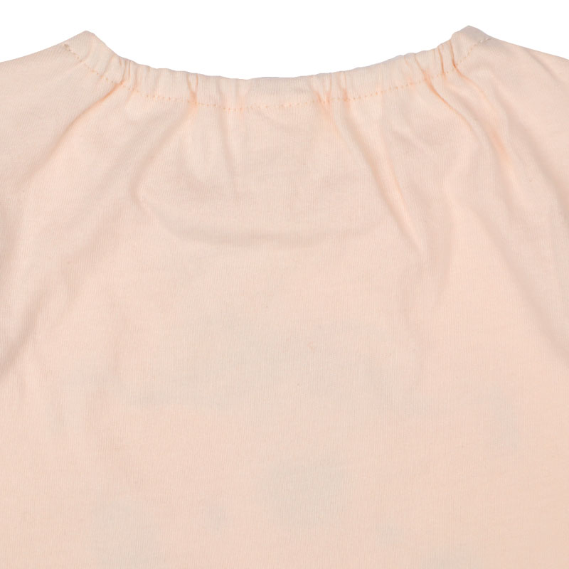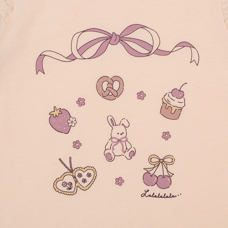 動きやすく快適でやさしい綿100%素材に、ヒラヒラ可愛い肩フリル付きのフレアーシルエット、女の子に人気のメルヘン前面プリント、そしてらくらく着用できる首回りゴム仕様を組み合わせたアイテムです。