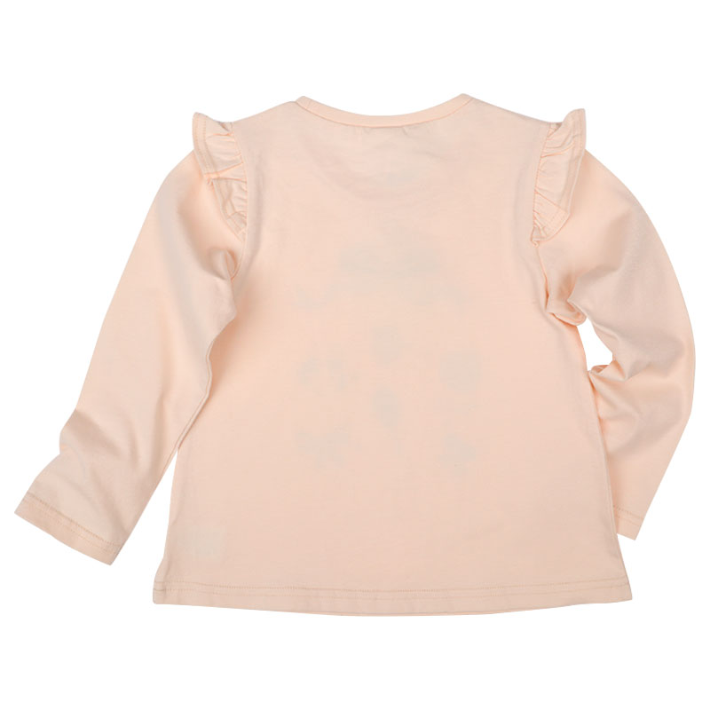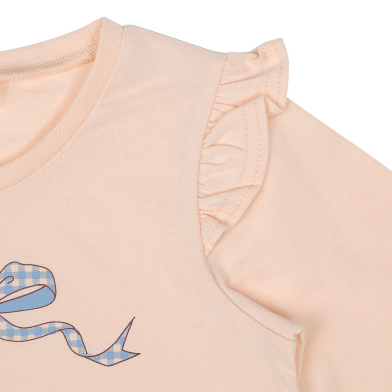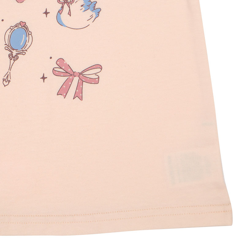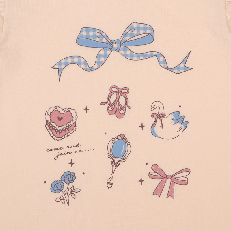 動きやすく快適でやさしい綿100%素材に、ヒラヒラ可愛い肩フリル付きのフレアーシルエット、女の子に人気のメルヘン前面プリント、そしてらくらく着用できる首回りゴム仕様を組み合わせたアイテムです。