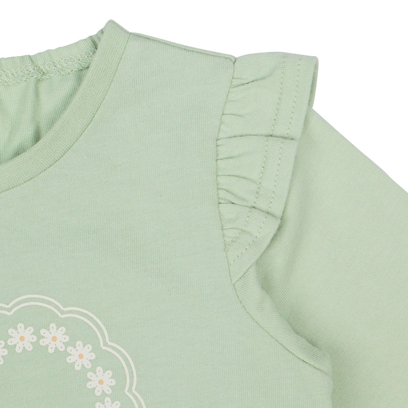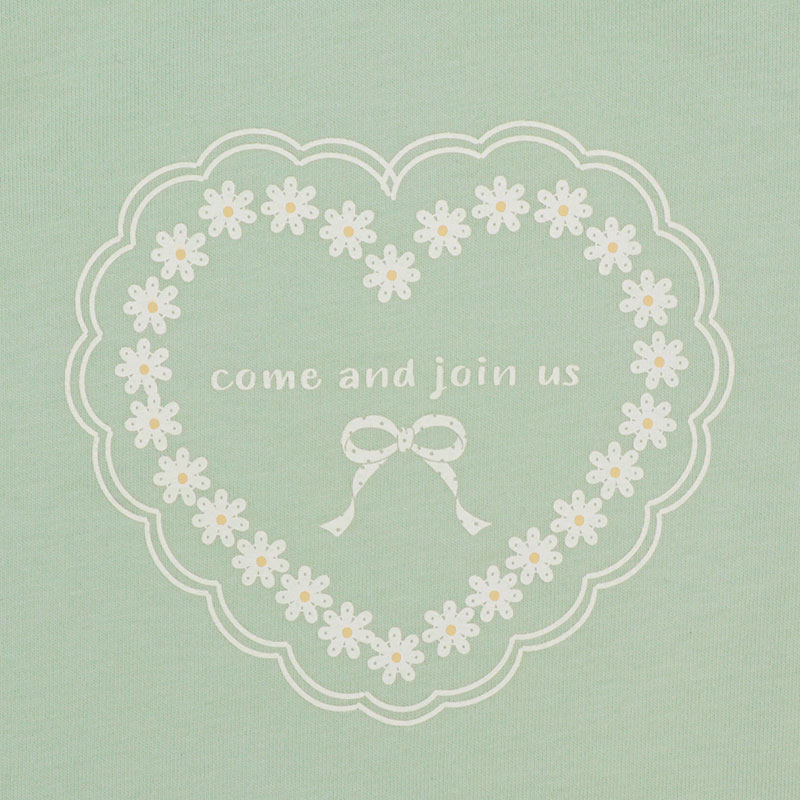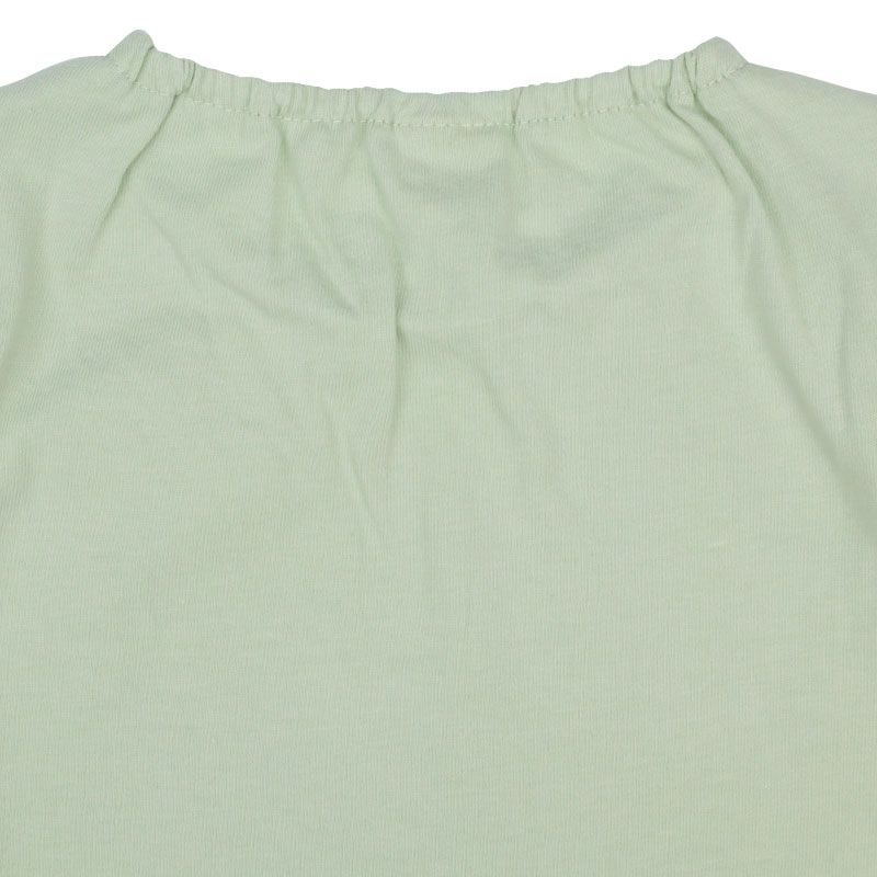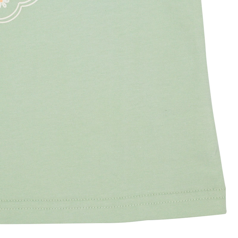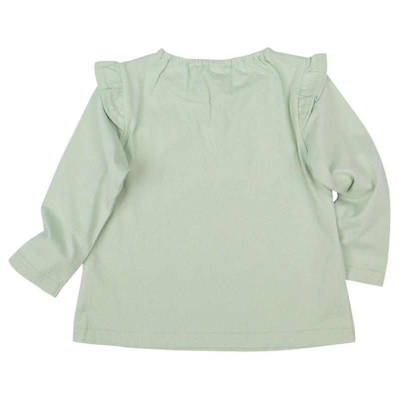 動きやすく快適でやさしい綿100%素材に、ヒラヒラ可愛い肩フリル付きのフレアーシルエット、女の子に人気のメルヘン前面プリント、そしてらくらく着用できる首回りゴム仕様を組み合わせたアイテムです。