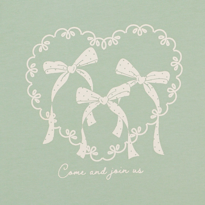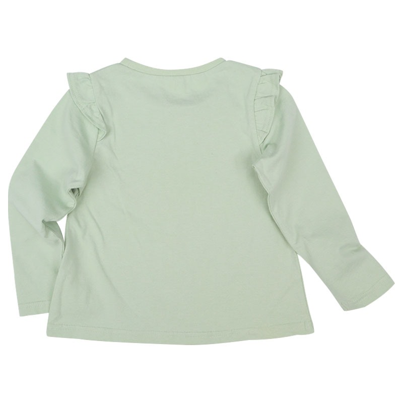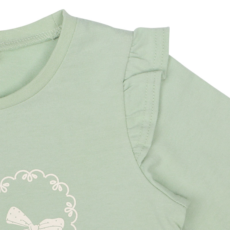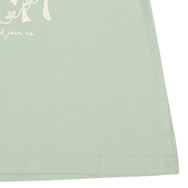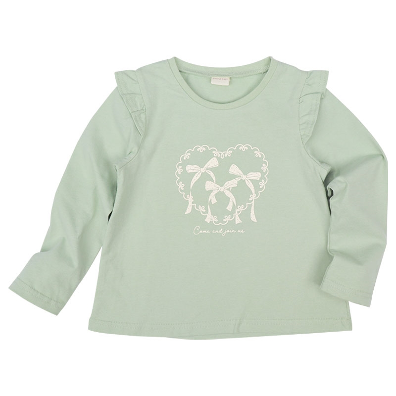 動きやすく快適でやさしい綿100%素材に、ヒラヒラ可愛い肩フリル付きのフレアーシルエット、女の子に人気のメルヘン前面プリント、そしてらくらく着用できる首回りゴム仕様を組み合わせたアイテムです。