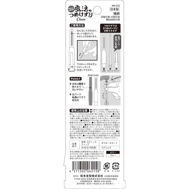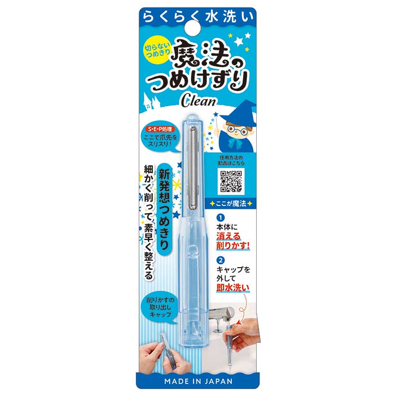 削るから安心 キラッと仕上がる爪切り キャップを外して即水洗い ●切らないつめきり削った爪の先端はキラッと輝く仕上がりに。 ●みるみる削れて爪粉は本体内部に入りますので、どこでも使用可能です。 ●深爪、割れ爪、2枚爪、ワレ、カケ等の爪先のトラブルを解消。削るので安心してお使いいただけます。 ●全パーツが水で丸洗い可能。 キャップを外してスティックを取り出せば、本体が筒状になり、隅々まで洗いやすくなっております。