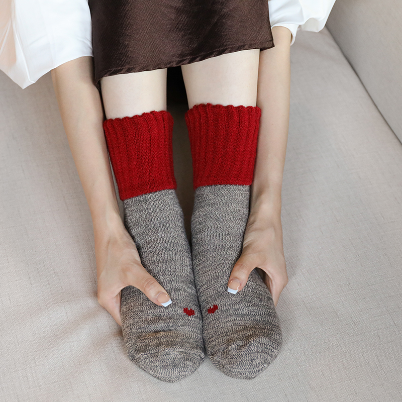 糸の中に多くの空気を含むように加工されたアクリルバルキー糸を使用し、冷気から足元を守ってつま先まで保温します。鍼灸師おすすめ「大衝(たいしょう)」のツボ位置にワンポイントデザインを配置。 レディース(23~25cm):ハート型ワンポイント