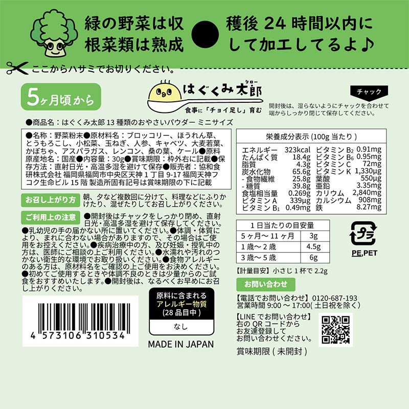 ●内容量:30g ●名称:野菜粉末 ●原材料名:ブロッコリー、ほうれん草、とうもろこし、小松菜、玉ねぎ、人参、キャベツ、大麦若葉、かぼちゃ、アスパラガス、レンコン、桑の葉、ケール