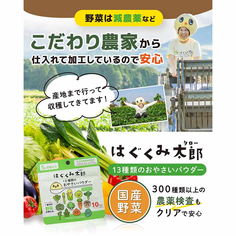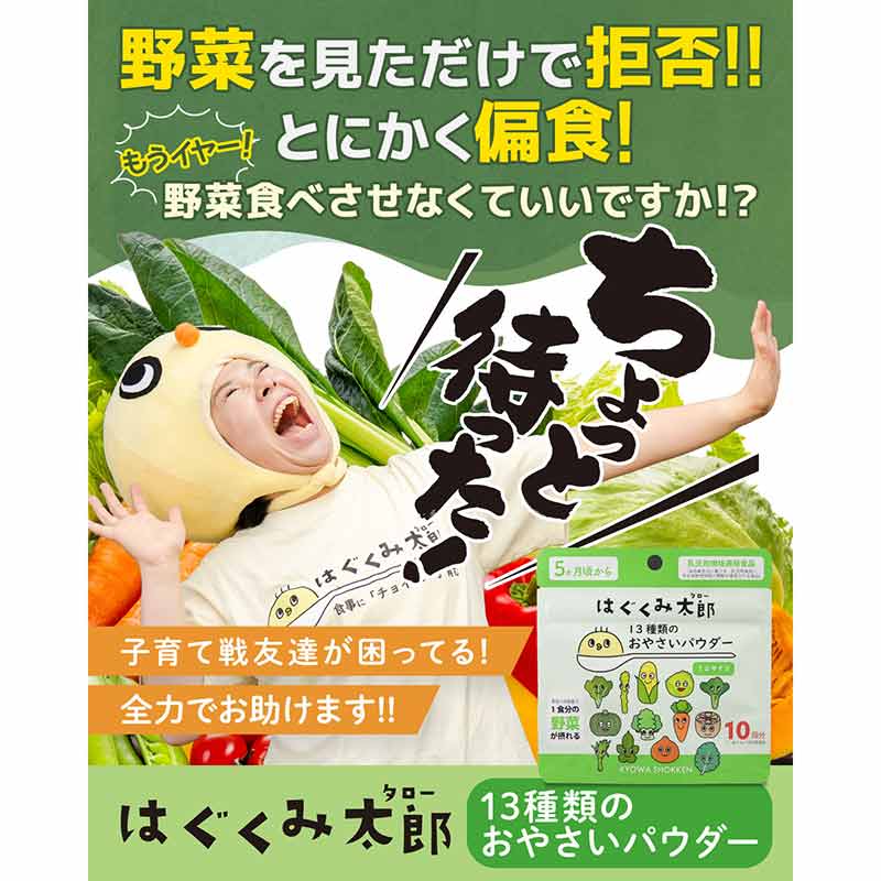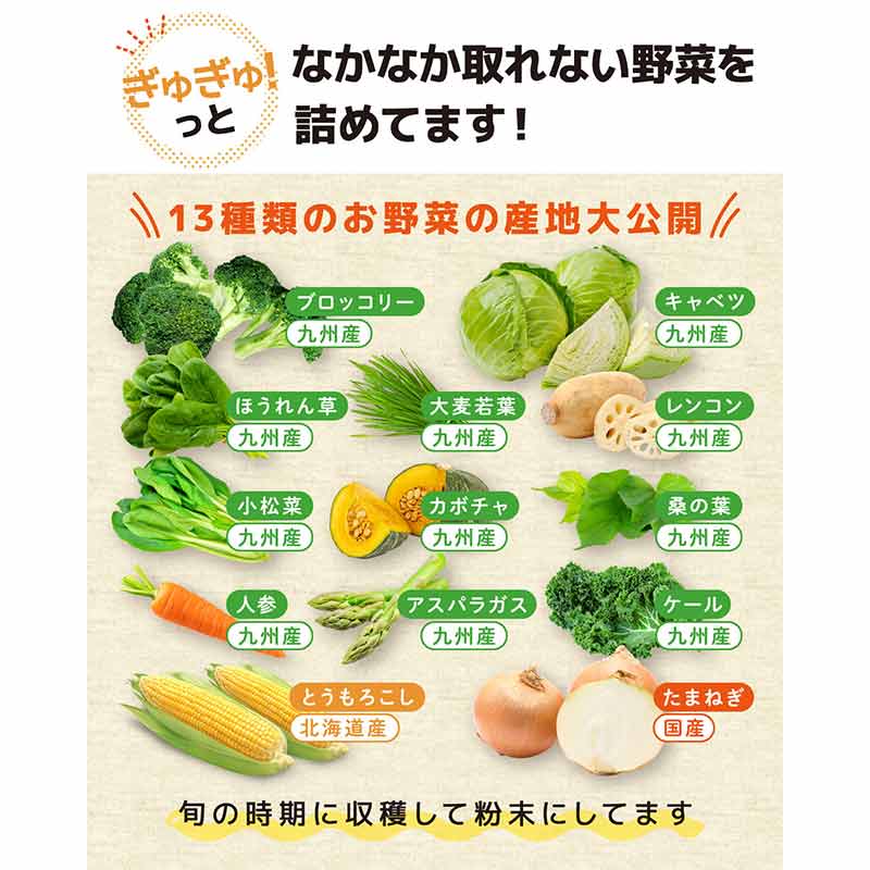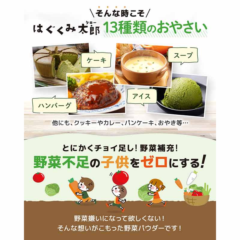 13種類のお野菜が一回でとれる優れもの 1食分の野菜が太郎のパウダー3gで取れる優れものです。 野菜は煮たり、蒸したり、焼いたり…加工が大変なので同じ野菜になりがちですが、13種類も入っているので野菜からとれる栄養素もまんべんなくカバーできます。