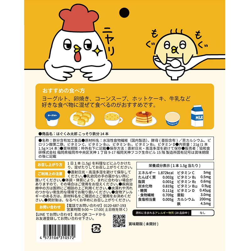 ●内容量:1包1.5g×14本 ●原材料名:水溶性食物繊維(国内製造)、酵母(亜鉛含有)/貝カルシウム、ピロリン酸第二鉄、ビタミンC、ビタミンB12、ビタミンB1、ビタミンB2、 ビタミンD