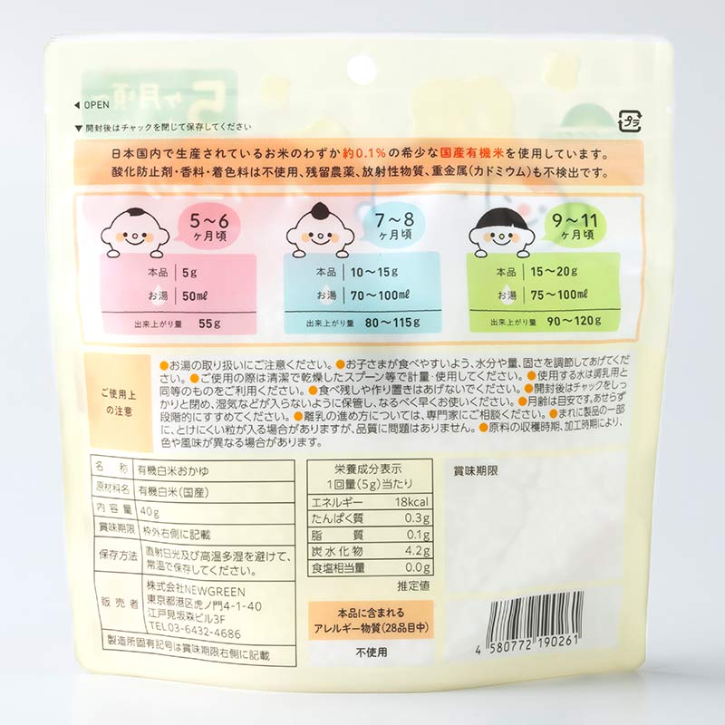●原材料名:有機白米(国産) ●内容量:40h 原料は化学肥料・農薬不使用の国産有機米。 栄養価および米本来の甘みと旨みに優れ、離乳食に最適。 残留農薬、放射能、重金属(カドミウム)不検出。保存料、着色料、香料、食塩、砂糖、油不使用、アレルギー物質(28品目中)不使用、グルテンフリー