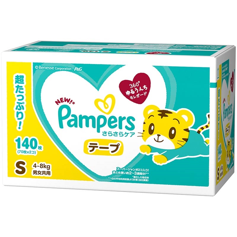 ●テープタイプ ●適用サイズ:Sサイズ ●適応体重:4-8kgまで ●商品枚数:70枚×2(140枚) ●原材料・成分:素材 表面材: ポリオレフィン不織布/ 吸収材: ポリエステル不織布、ポリオレフィン不織布、 綿状パルプ、高分子吸水材/ 防水材: ポリオレフィンフィルム/ 止着材: ポリオレフィン/ 伸縮材: 合成ゴム/ 結合材: ホットメルト粘着材
