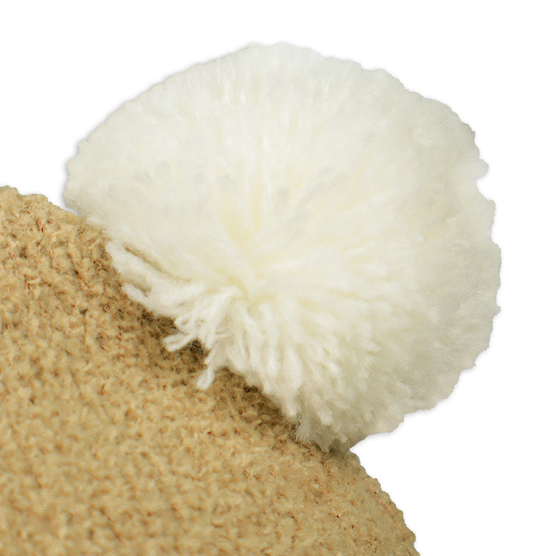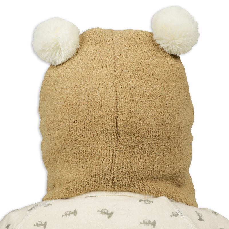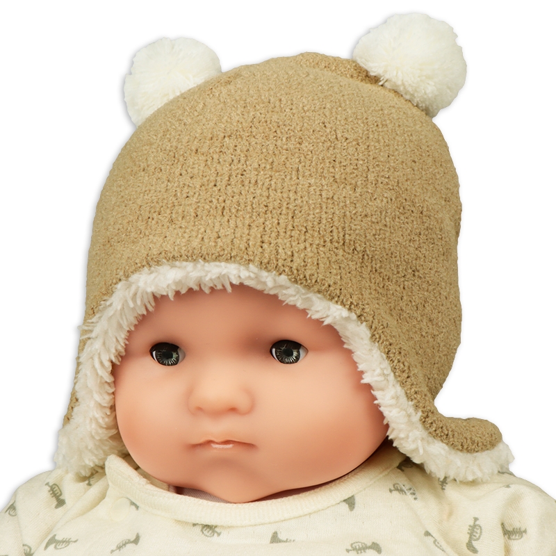 本体に柔らかい肌触りの糸を使用したアイテムです。 淡いトーンの配色がやさしく映えます。 ボンボンによる耳モチーフ付きで、可愛らしいアクセントになります。 ウィンター仕様の裏ボア帽子なので、お子様の耳まで暖かく包み込みます。