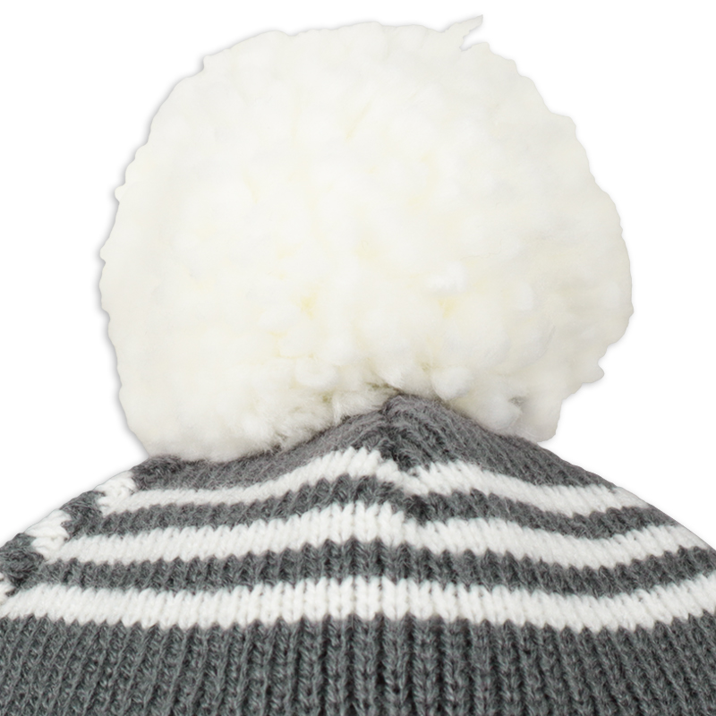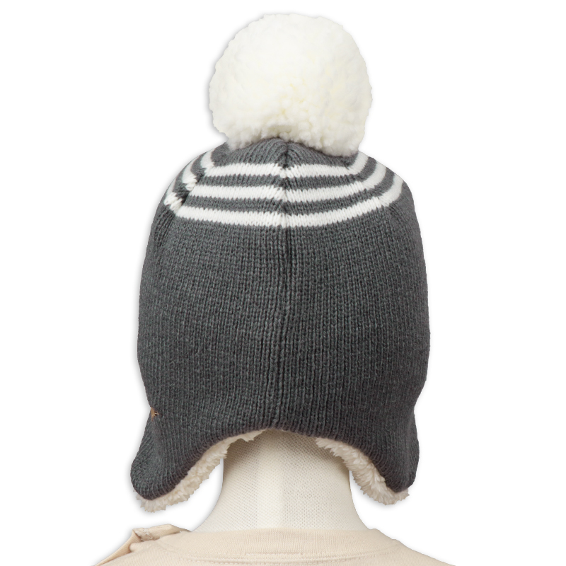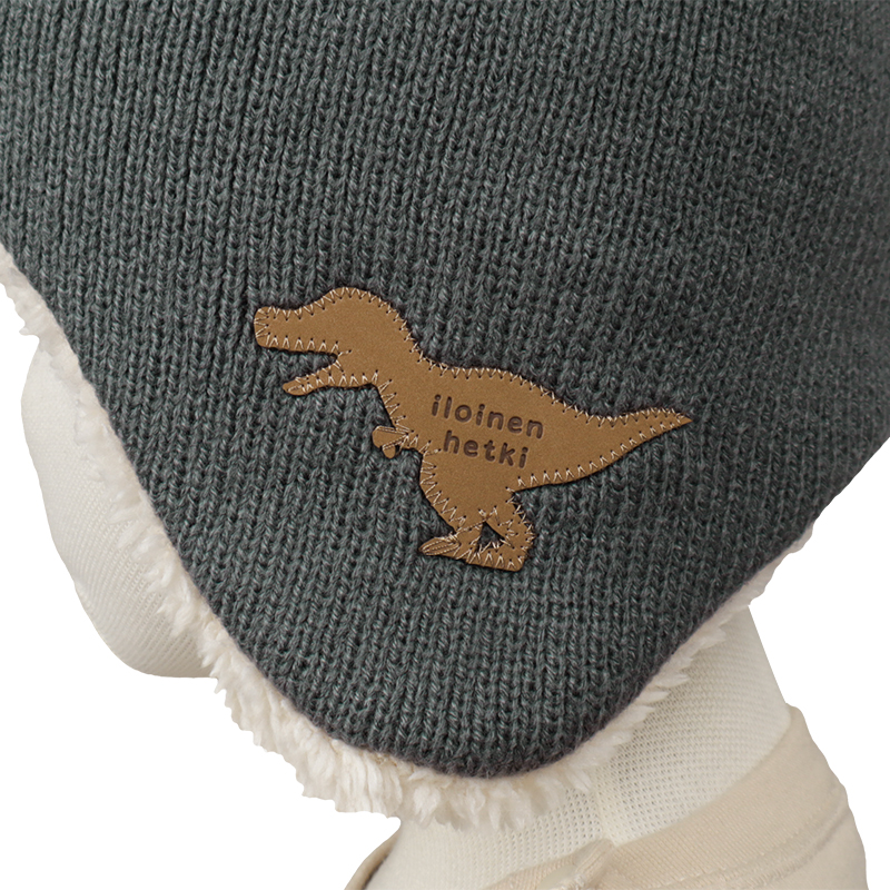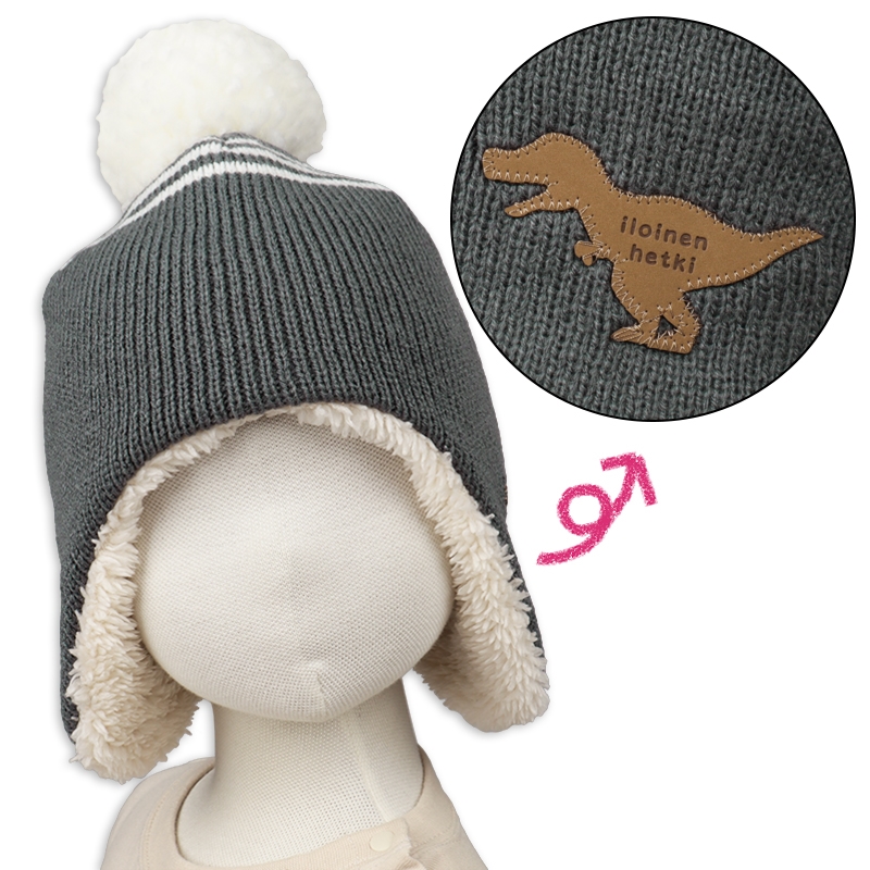 左サイドを飾る、恐竜シルエットネームがおしゃれなアイテムです。 アースカラーとホワイトカラーの配色がかっこいい。 ボリュームのあるボンボンがアクセントになります。 ウィンター仕様の裏ボア帽子なので、お子様の耳まで暖かく包み込みます。