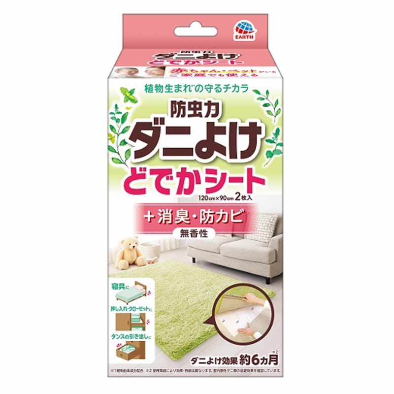 植物由来成分配合でダニよけ効果が約6ヵ月間持続します。 (使用環境により効果・持続は異なります。屋内塵性ダニ類の忌避効果を確認しています。) 化学殺虫成分不使用なので、薬剤に敏感な方や、お子様やペットがいるご家庭にもオススメです。 ダニよけだけでなく、消臭・防カビ効果もあります。 (製品と接した対象物の防カビ効果を確認しています。) 用途に合わせてカットできる大判シート。120cm×90cm 2枚入。 お取替え目安シール付。交換時期が分かって便利!