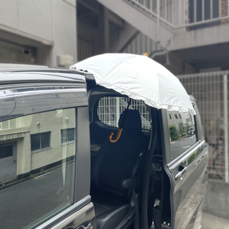 雨の日に、濡れずに車へ乗せ降ろしができる傘ピタ。