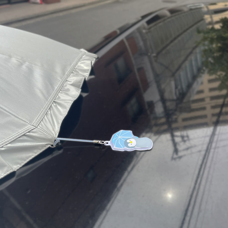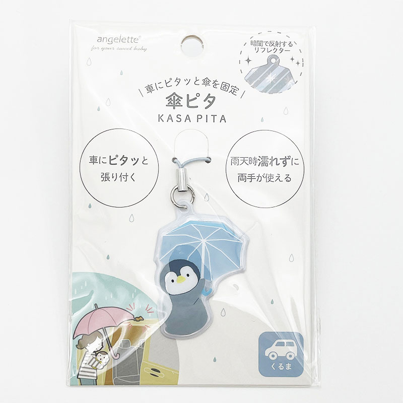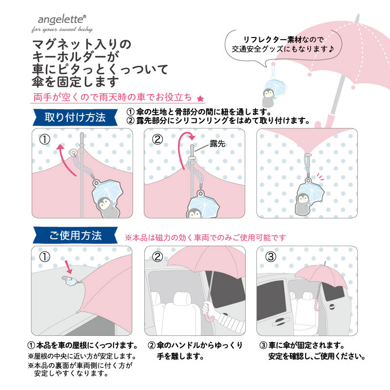 雨の日に、濡れずに車へ乗せ降ろしができる傘ピタ。 マグネット入りのチャームを傘に装着し、 車の屋根部分に乗せるだけでピタっと簡単に傘を固定でき両手をあけられます。 お子様を車に乗せ降ろしする際や、荷物の出し入れ時に活躍。 濡れずに両手で動作をおこなえて便利。 アンジェレッテオリジナルデザインで、傘の目印にもなります。