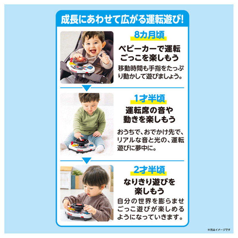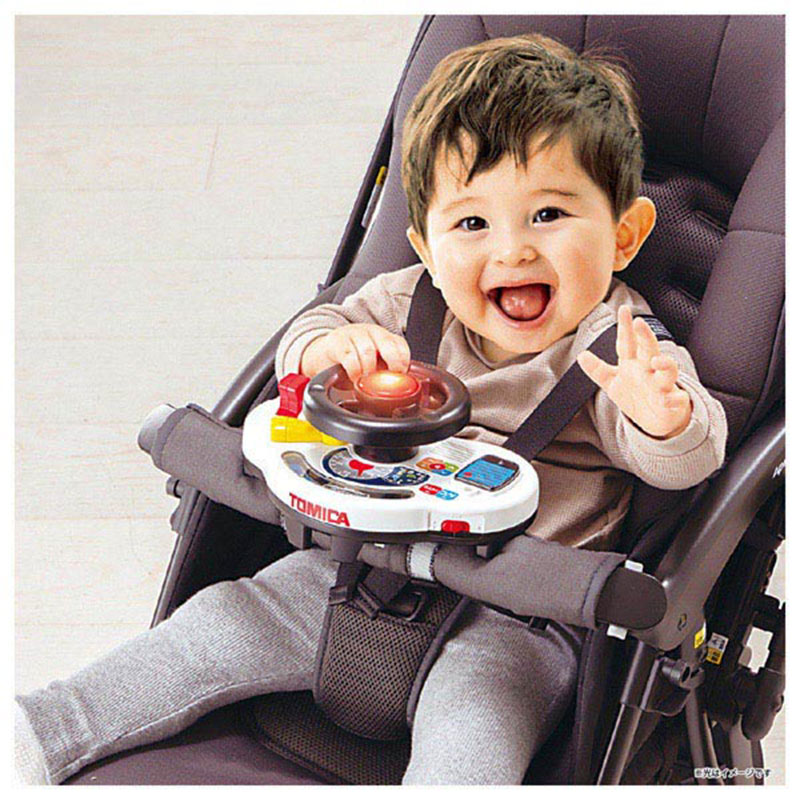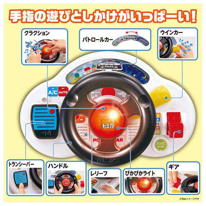ベビーカーでパトロールに出発! おでかけでもおうちでも運転ごっこが楽しめる、 しかけがいっぱいのトミカのサウンドハンドル! ・リアルな音と光で運転ごっこが楽しめる豊富な遊び クラクション、ウィンカー、ギア、ハンドル、レリーフ、トランシーバー ・クラクションはぴかぴか光ったり、リアルなサウンドも楽しめます。 ・メロディは5曲 (収録曲例:ひろがるトミカワールド!や森のくまさんなど) ・セリフと効果音は19種類 ・取り付けベルトでベビーカーにしっかり固定できるので、 お出かけ中も遊びやすい! ※取り付けられるフロントガードの太さは最大外周約9.5cmまで ・サイレン音は「おうちモード」でON、 「おでかけモード」でOFFに切り替えられます。 公共の場所でも「おでかけモード」で安心して遊んでいただけます。 ・CUD(カラーユニバーサルデザイン)対応商品です。