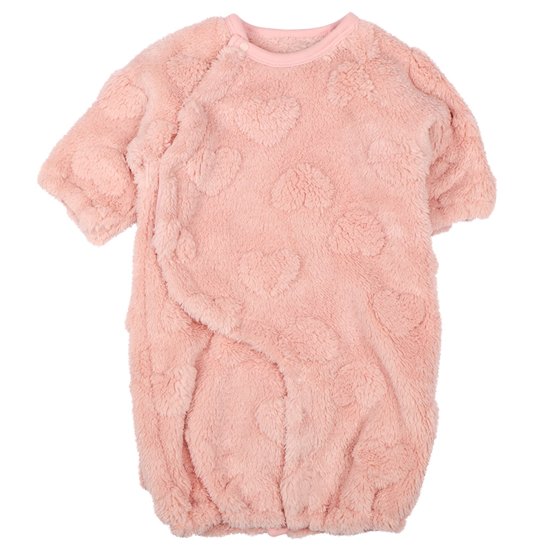 モコモコで優しい肌触りの生地に立体でハートの模様の入ったあったかドレスオールです。 ふわもこの手足がぬいぐるみのようでぎゅと抱きしめたくなるかわいらしいデザインです。 ふわふわ優しい肌触りでふんわり軽く保温性に優れた着心地で外出はもちろん部屋着としても使っていただけます。 赤ちゃんの動きを妨げないデザイで伸縮性のある素材を使用しているので手足をバタバタ動かすようになってきた元気な赤ちゃんにピッタリです。 前身頃が襟ぐりから足元まで全開するので着脱がしやすくお着替えやおむつ交換が楽ちんな設計です。 股下のボタンのとめかた次第でドレスオールとプレオールの2WAYになるので赤ちゃんの成長に寄り添って長く活躍します。