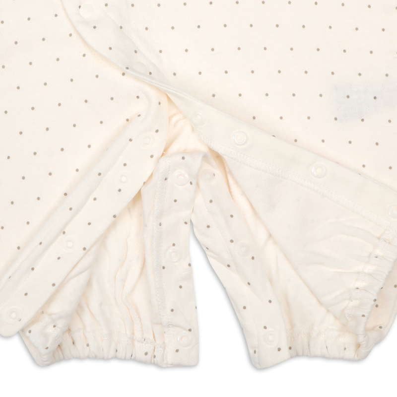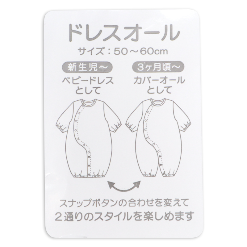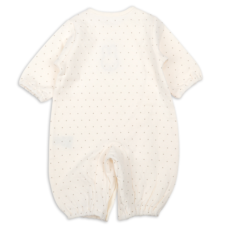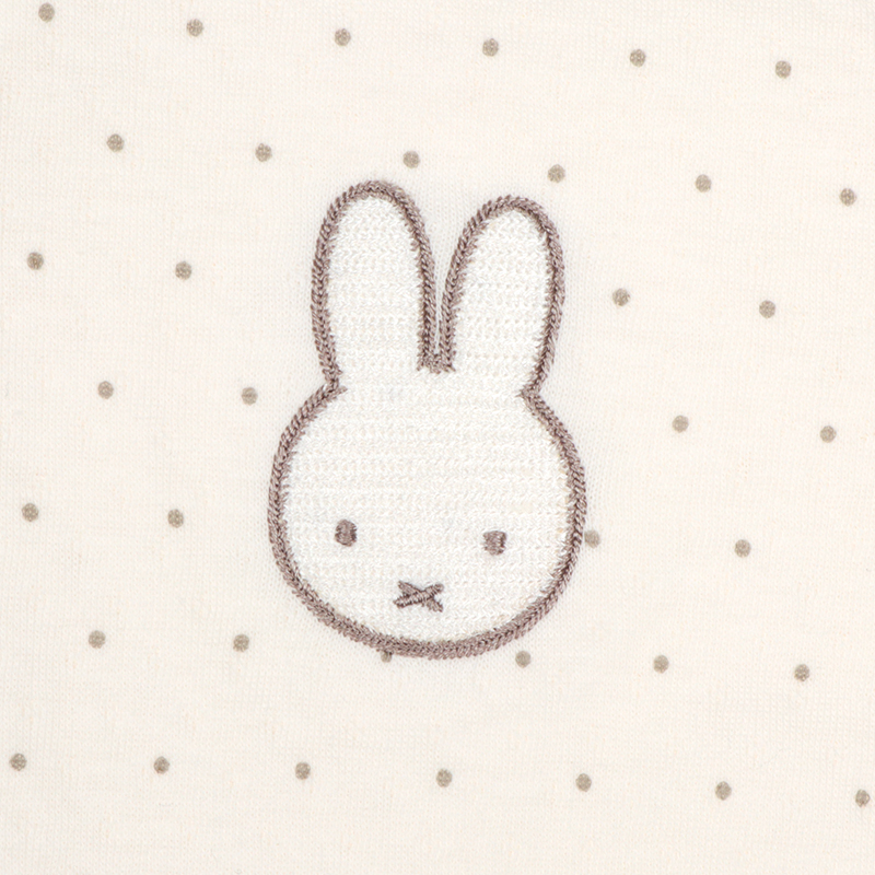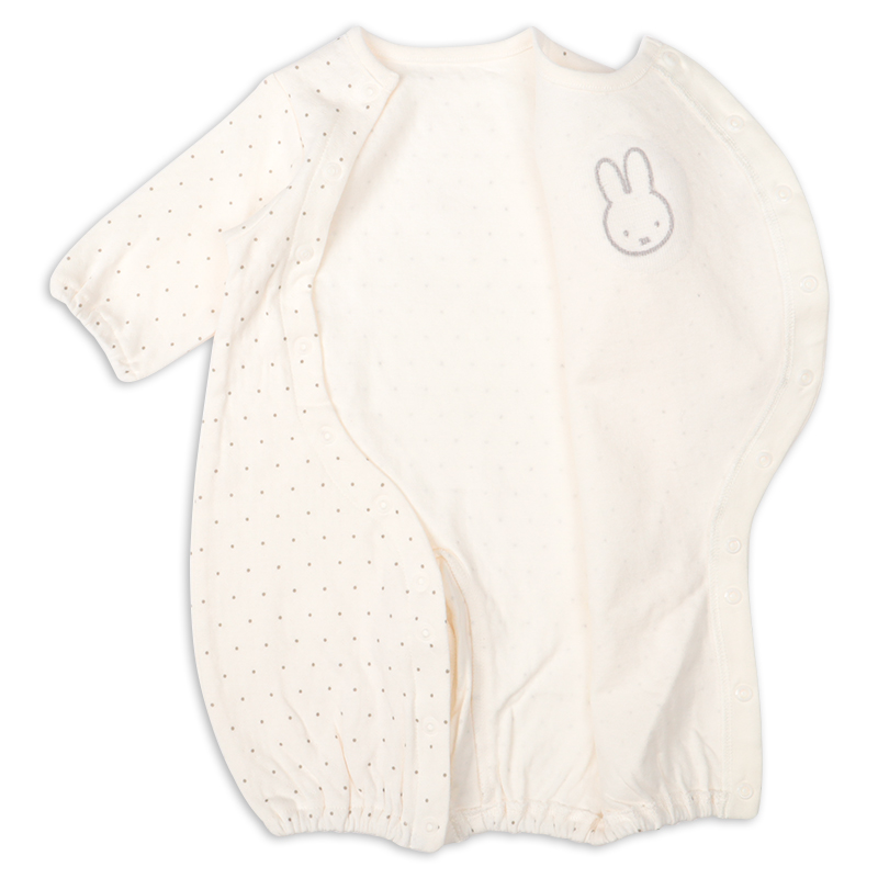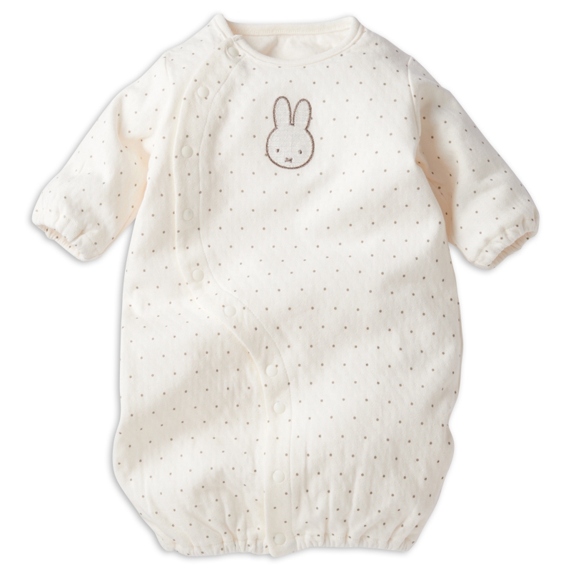 正面のミッフィーの刺繍が目を引くドット総柄の新生児ドレスオールです。 足をあまり動かさない時期はドレス型で、たくさん動けるようになったらパンツ型にして、 赤ちゃんの成長に合わせて長く使える、便利なツーウェイドレスです。