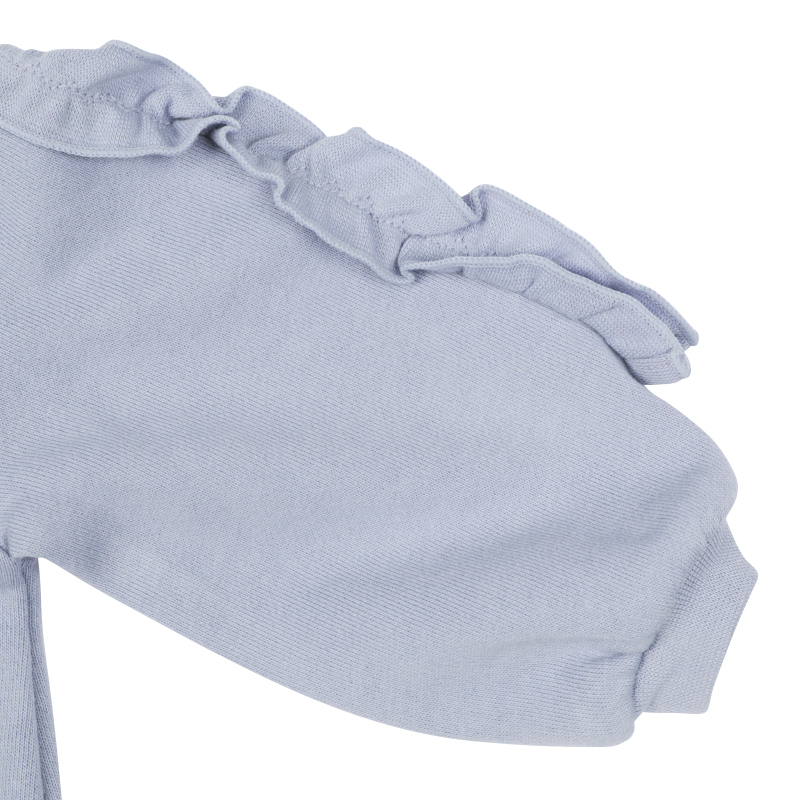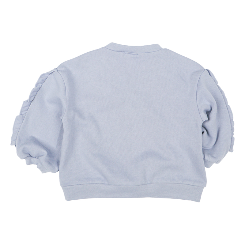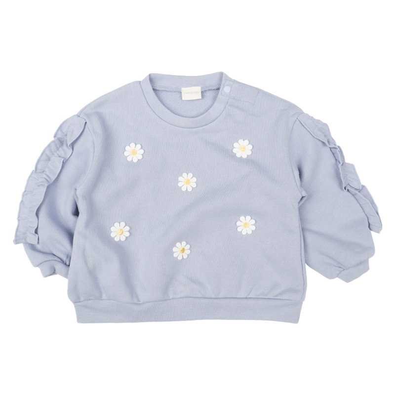 前身につけたお花のモチーフがポイントのトレーナー。ふっくらお袖に、身頃と同色の控えめなフリルをつけました。シンプルなトレーナー型なので、着合わせもしやすく、コーディネートの巾も広がります。名前が書けるお名前タグ付きです。