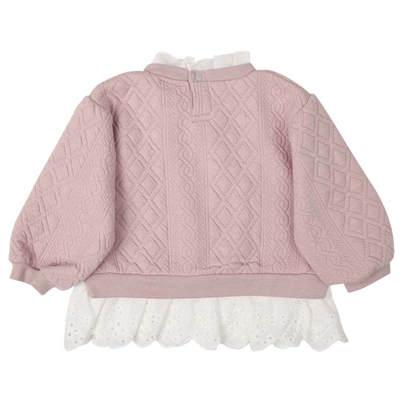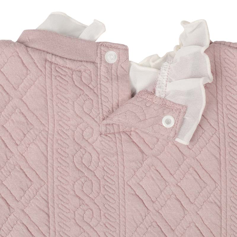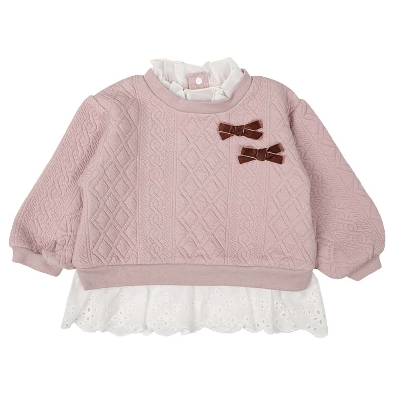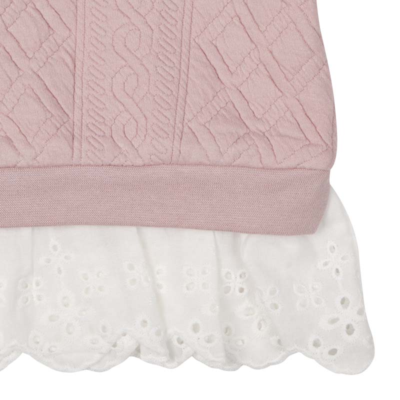 本体:ポリエステル82%綿16%ポリウレタン2% リブ部分:ポリエステル63%綿34%ポリウレタン3% 衿フリル:ポリエステル100% 裾フリル:綿100% 【80cm】着丈35胸囲59肩幅27袖丈25 【90cm】着丈38胸囲62肩幅28袖丈29 【95cm】着丈39.5胸囲64肩幅29袖丈31