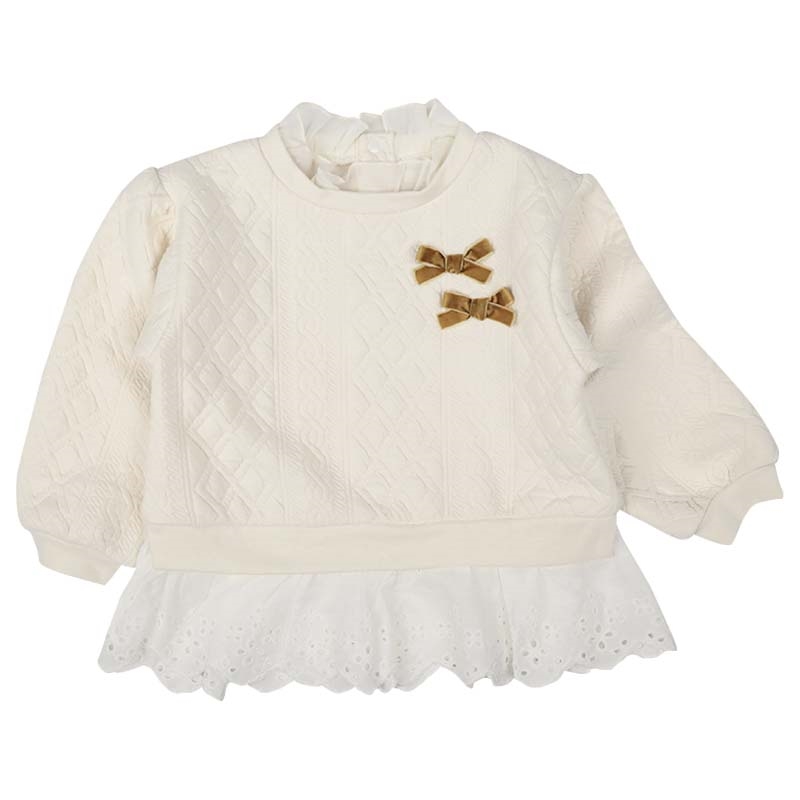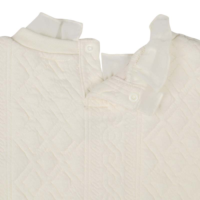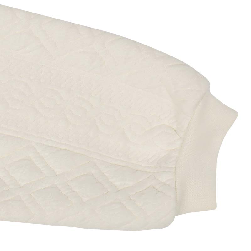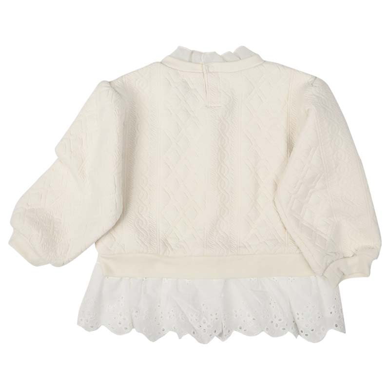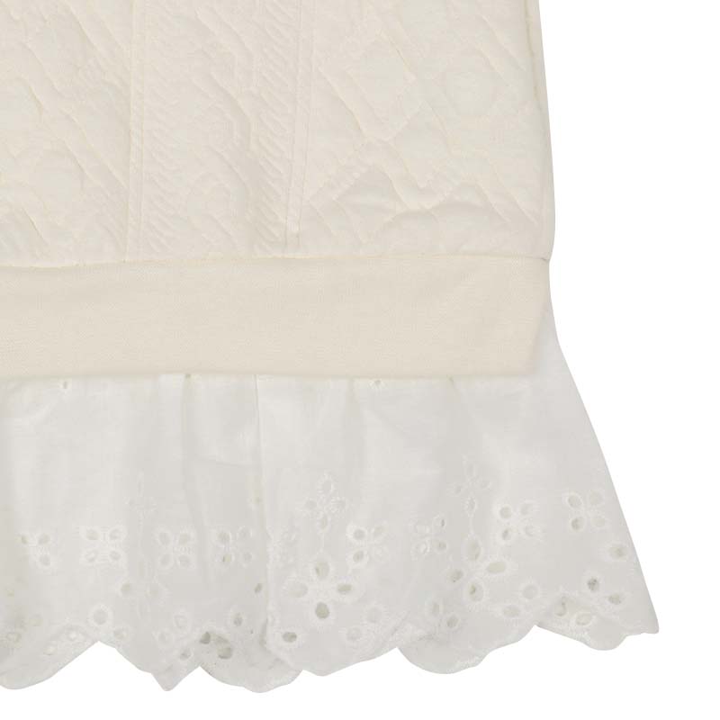 本体:ポリエステル82%綿16%ポリウレタン2% リブ部分:ポリエステル63%綿34%ポリウレタン3% 衿フリル:ポリエステル100% 裾フリル:綿100% 【100cm】着丈41胸囲66肩幅30袖丈31 【110cm】着丈44胸囲70肩幅32袖丈35.5 【120cm】着丈47胸囲74肩幅34袖丈40