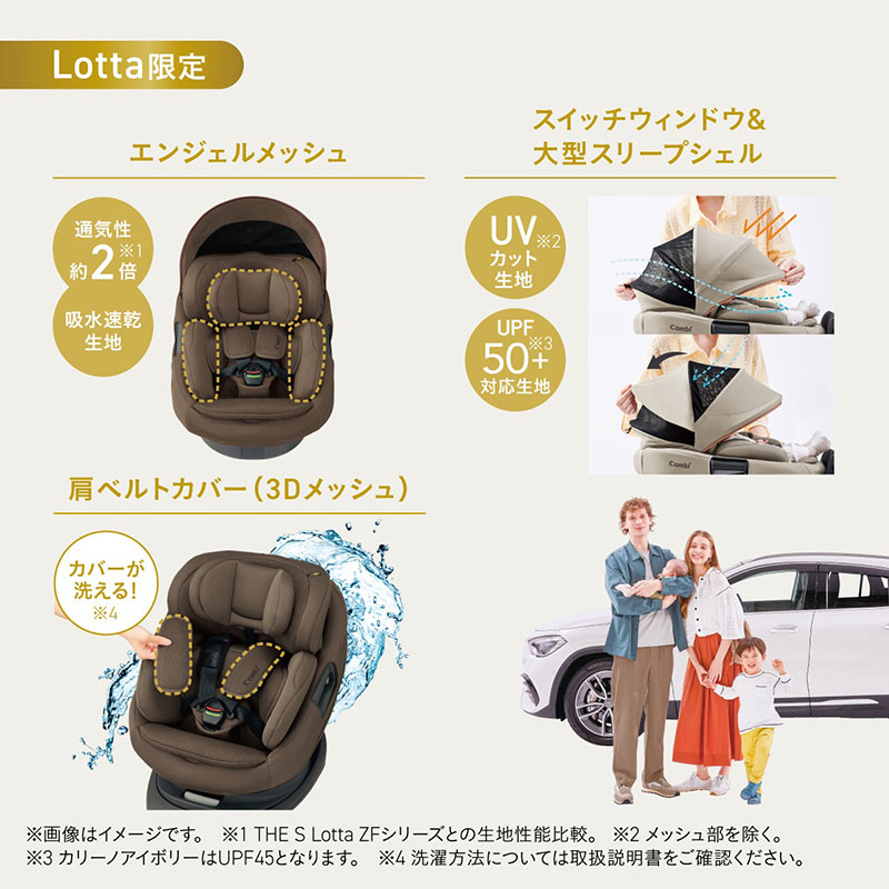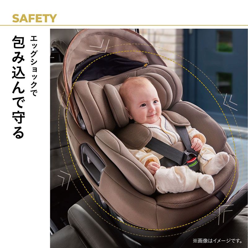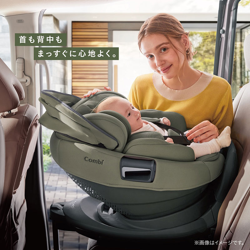 赤ちゃんの首から背中をまっすぐ支えるコンパクトベッド型。 「新クッション形状」と搭載範囲を拡大した 超・衝撃吸収素材「エッグショック」で赤ちゃんの快適性を追求。 取付ラクラク・お部屋にも持ち運べるコンビ独自のセパレートはそのままに、 初めての子育てを支えるチャイルドシートに進化しました。 人気のコンパクトベッド型※1チャイルドシート THESがリニューアル! ※1 進行方向に対して後向き使用時、背もたれと座面の内閣が150°以上寝かせられる構造。 《フラットクッション》 首から背中をまっすぐに支え、赤ちゃんの自然な姿勢を保ち、 ベッドのような快適な寝心地を目指した新しいカタチです。 新生児期から、体格・成長に合わせて 65cm~75cmまで使用ができます(後向き使用時のみ)。 クッションの使用期間が短いと、 まだ支えが必要かも…と不安になることも。 赤ちゃん想い設計のフラットクッションなら、 成長や体格に合わせて無理なく卒業できます。 《超・衝撃吸収素材「エッグショック」》 本体頭部の両側面に厚みのあるエッグショックを新搭載※2 さらに赤ちゃんを包み込むように身体部のエッグショックの搭載箇所を拡大※2し、 チャイルドシートを卒業するまでずっと守り続けます。 ※2 THE S R129 エッグショック ZFからの変更点 《ロッタ限定機能》 ・エンジェルメッシュ 頭部・クッション両側に通気性が約2倍※3になった 吸水速乾生地「エンジェルメッシュ」採用。 ・スイッチウィンドウ&大型スリープシェル 赤ちゃんの様子が見えるメッシュウィンドウの位置を変えられます。 ・肩ベルトカバー(3Dメッシュ) 肌触り良く丸洗い※4ができて清潔に使用ができます。 ※3 THE S Lotta ZFシリーズとの生地性能比較。 ※4 洗濯方法については取扱説明書をご確認ください。