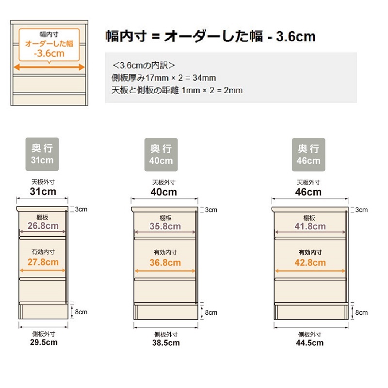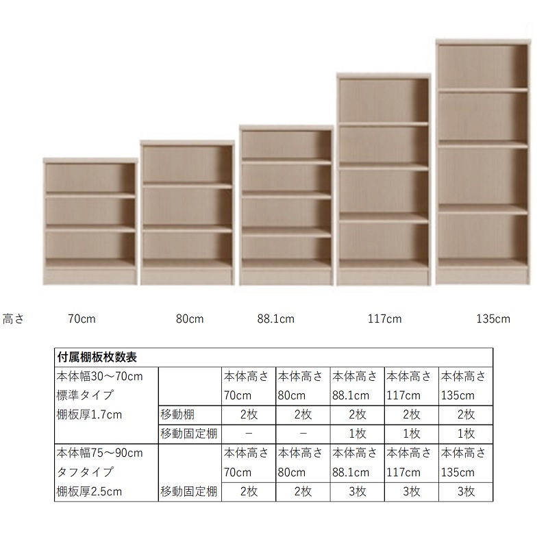 ※サイズは商品の外寸を表記しています。 ●サイズ(外寸):奥行46cm×高さ70cm×幅45cm ●有効内寸:42.8cm ●側板(内寸):43.2cm ●側板(外寸):44.5cm ●有効内寸幅:外寸幅-(マイナス)3.6cm ●材 質:プリント紙化粧繊維板 ●塗 装:ウレタン樹脂塗装 ●棚 板:厚さ17mm移動棚2枚 付