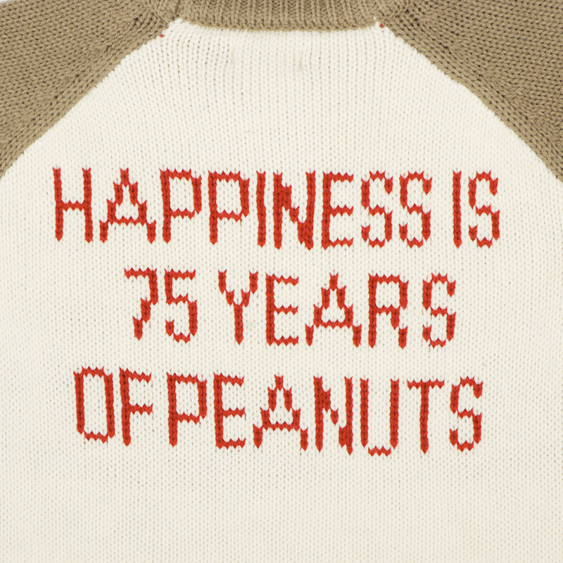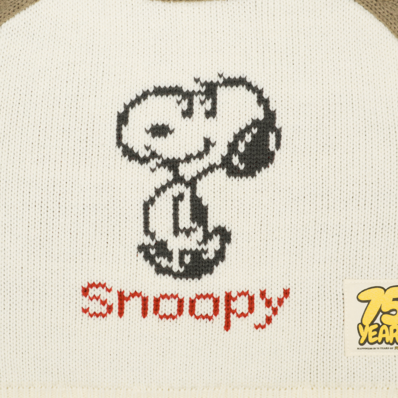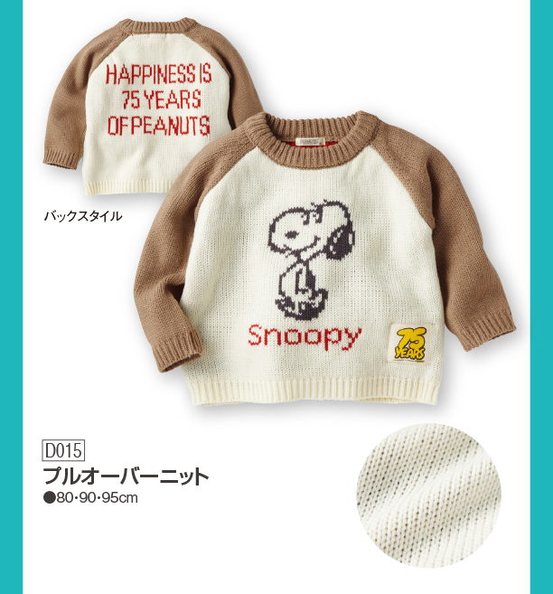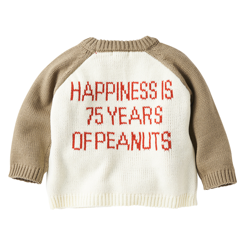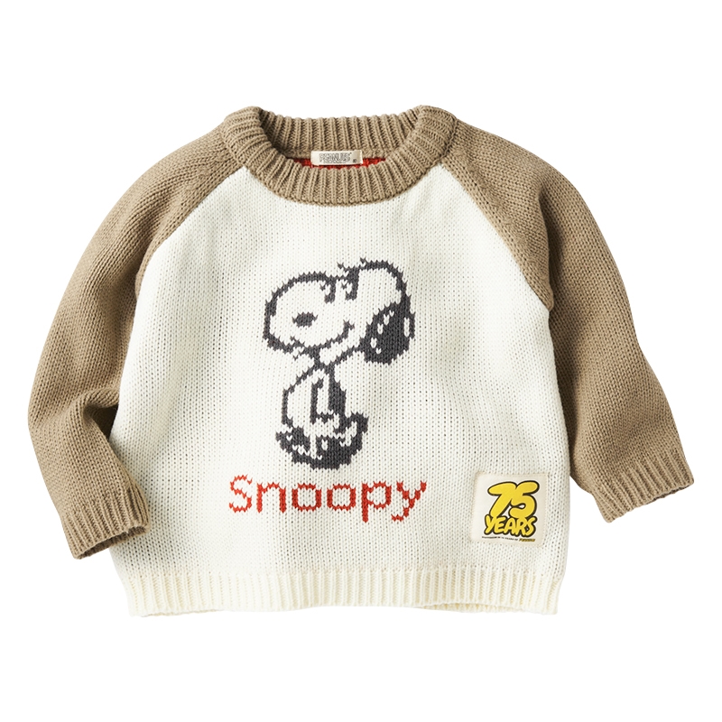 赤ちゃん本舗オリジナルデザインのニットトレーナーです。PEANUTS75周年限定アートを使用しています。 前後に大きく入ったSNOOPYとロゴ使いがポイントです。 男の子も女の子もコーディネートできるナチュラルカラーがかわいいニットトレーナーです。