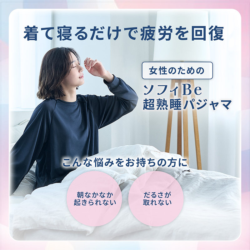 ソフィBe超熟睡パジャマは、着て寝るだけで疲労を回復する女性のためのリカバリーパジャマです。 AATH Medical繊維が血行促進・疲労回復。女性のことを考えた機能性とデザイン性を兼ね備えています。