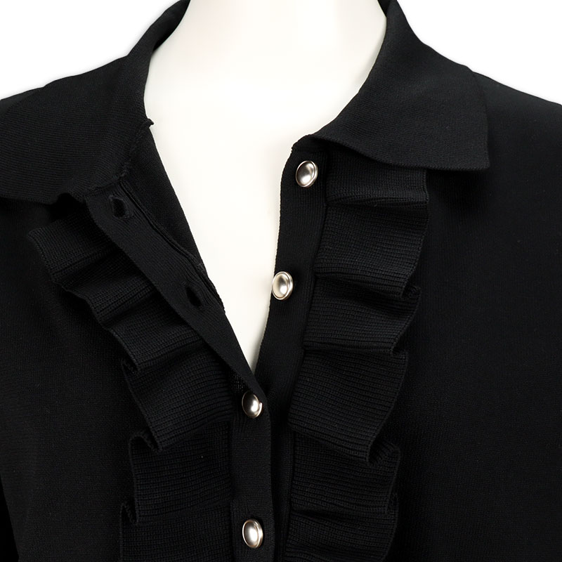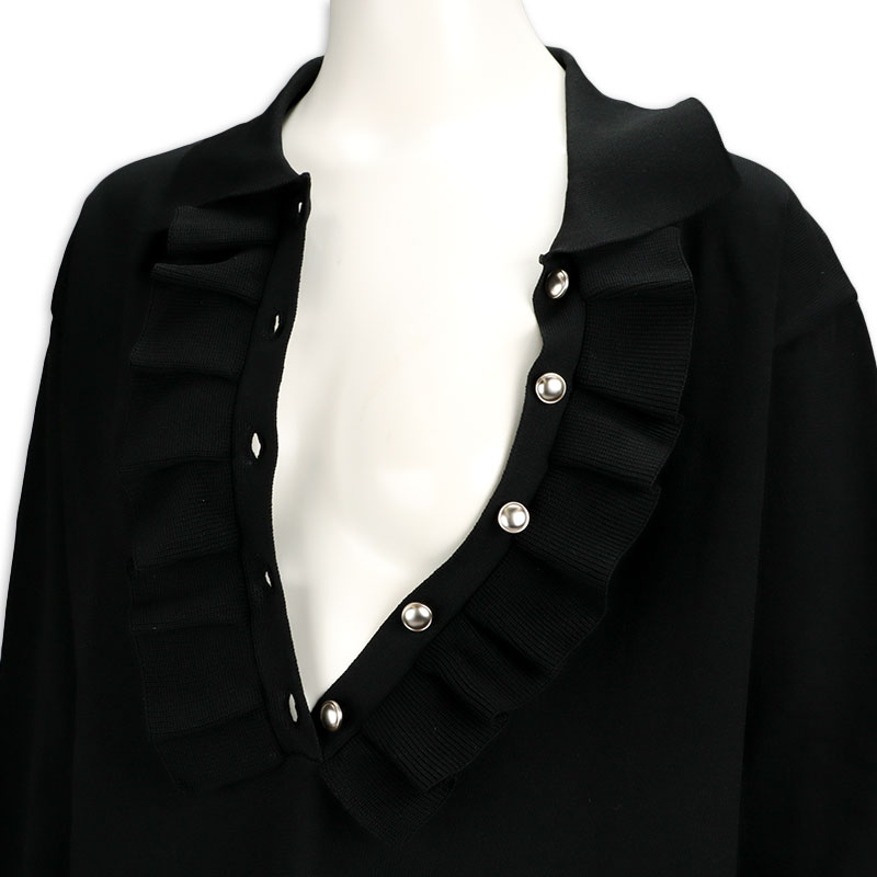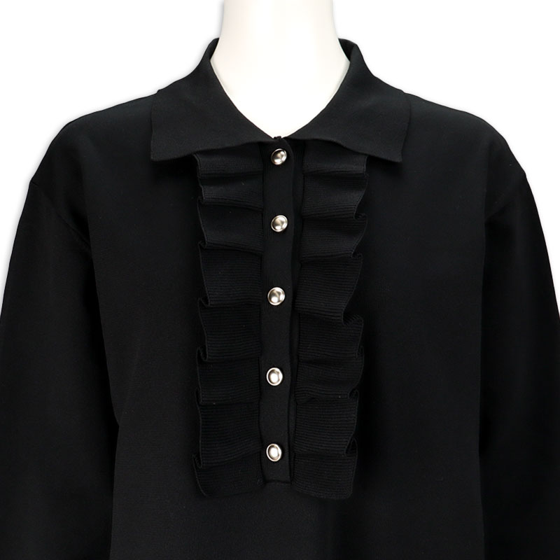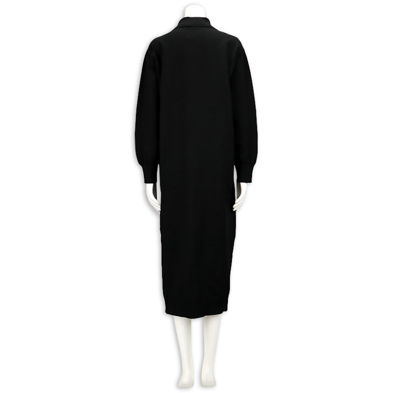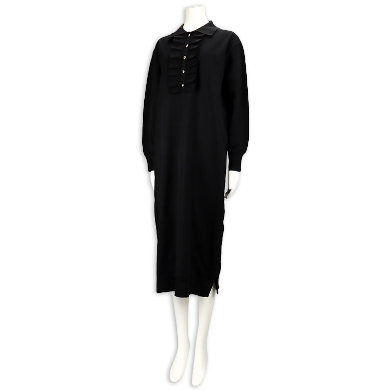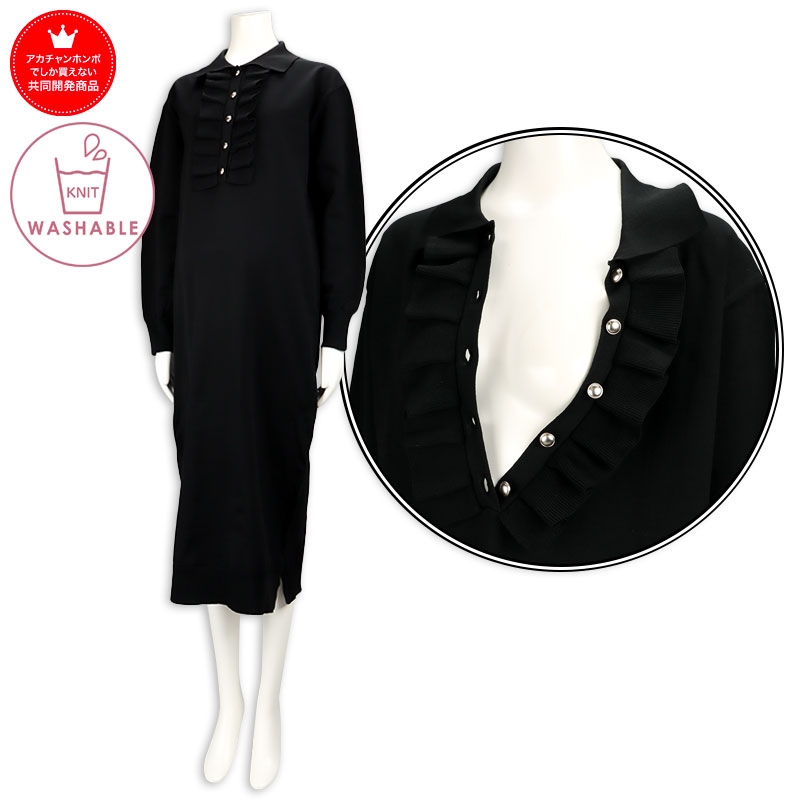 クラシカルなポロ衿に、女性らしいフリルをプラスしたニットワンピース。ポロ衿とフロントのフリルが華やかなデザイン。前立て明きで授乳口もあり、産前産後に重宝するアイテム。着心地の良いニットで身体のラインを拾いすぎないシルエット。金属風釦でラグジュアリーに仕上げています。シワになりにくく、通勤・お出掛けにもピッタリです。