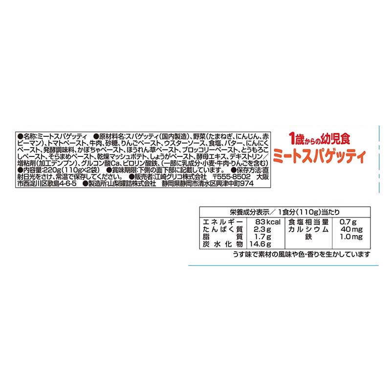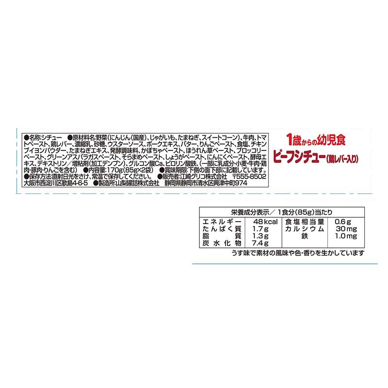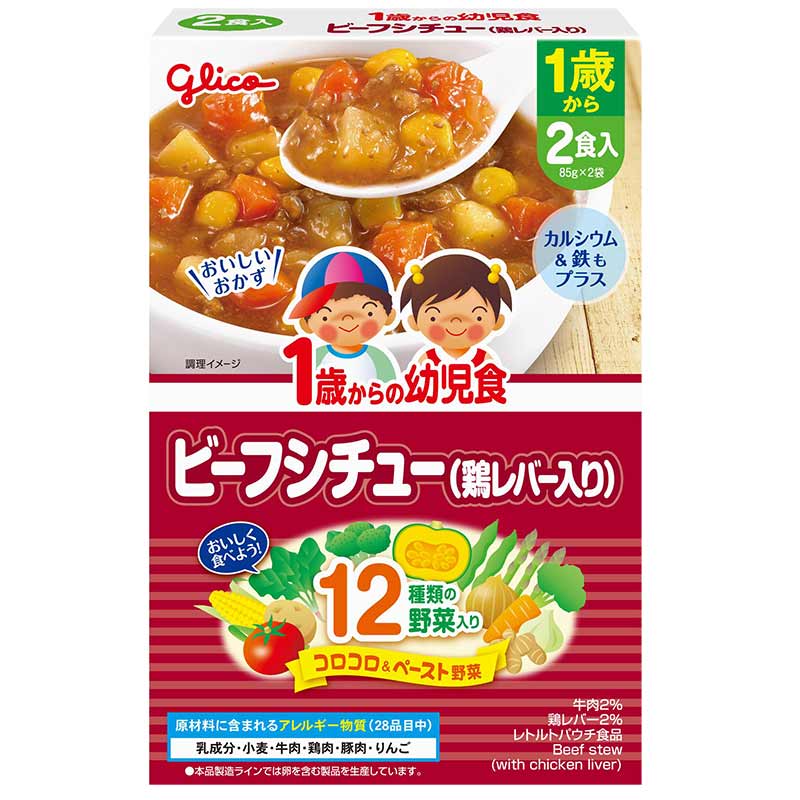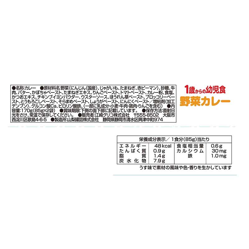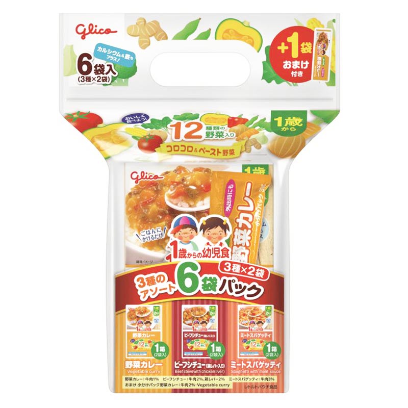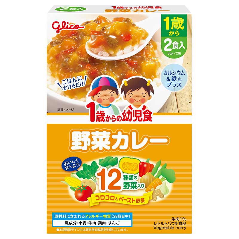 ●内容量:3箱アソート(野菜カレー、ミートスパゲッティ、ビーフシチュー)+小分けタイプの野菜カレー1包おまけ付き ●幼児食 野菜カレー ・原材料名:野菜(にんじん(国産)、じゃがいも、たまねぎ、赤ピーマン)、砂糖、牛肉、バター、かぼちゃペースト、たまねぎエキス、りんごペースト、トマトペースト、カレー粉、食塩、かつおエキス、チキンブイヨンパウダー、ウスターソース、ほうれん草ペースト、ブロッコリーペースト、とうもろこしペースト、そらまめペースト、しょうがペースト、にんにくペースト/増粘剤(加工デンプン)、グルコン酸Ca、ピロリン酸鉄、(一部に乳成分・小麦・牛肉・鶏肉・りんごを含む) ・内容量:170g(85g×2袋) ・栄養成分:その他 熱量 48kcal たんぱく質 0.9g 脂質 1.4g 炭水化物 7.9g 食塩相当量 0.6g カルシウム 30mg 鉄 1.0mg ●幼児食ミートスパゲティ ・原材料名:スパゲッティ(国内製造)、野菜(たまねぎ、にんじん、赤ピーマン)、トマトペースト、牛肉、砂糖、りんごペースト、ウスターソース、食塩、バター、にんにくペースト、発酵調味料、かぼちゃペースト、ほうれん草ペースト、ブロッコリーペースト、とうもろこしペースト、そらまめペースト、乾燥マッシュポテト、しょうがペ ースト、酵母エキス、デキストリン/増粘剤(加工デンプン)、グルコン酸Ca、ピロリン酸鉄、(一部に乳成分・小麦・牛肉・りんごを含む) ・内容量:220g(110g×2袋) ・栄養成分:その他 熱量 83kcal たんぱく質 2.3g 脂質 1.7g 炭水化物 14.6g 食塩相当量 0.7g カルシウム 40mg 鉄 1.0mg ●幼児食ビーフシチュー ・原材料名:野菜(にんじん(国産)、じゃがいも、たまねぎ、スイートコーン)、牛肉、トマトペースト、鶏レバー、濃縮乳、砂糖、ウスターソース、ポークエキス、バター、りんごペースト、食塩、チキンブイヨンパウダー、たまねぎエキス、発酵調味料、かぼちゃペースト、ほうれん草ペースト、ブロッコリーペースト、グリーンアスパラガスペースト、そらまめペースト、しょうがペースト、にんにくペースト、酵母エキス、デキストリン/増粘剤(加工デンプン)、グルコン酸Ca、ピロリン酸鉄、(一部に乳成分・小麦・牛肉・鶏肉・豚肉・りんごを含む) ・内容量:170g(85g×2袋) ・栄養成分:その他 熱量 48kcal たんぱく質 1.7g 脂質 1.3g 炭水化物 7.4g 食塩相当量 0.6g カルシウム 30mg 鉄 1.0mg