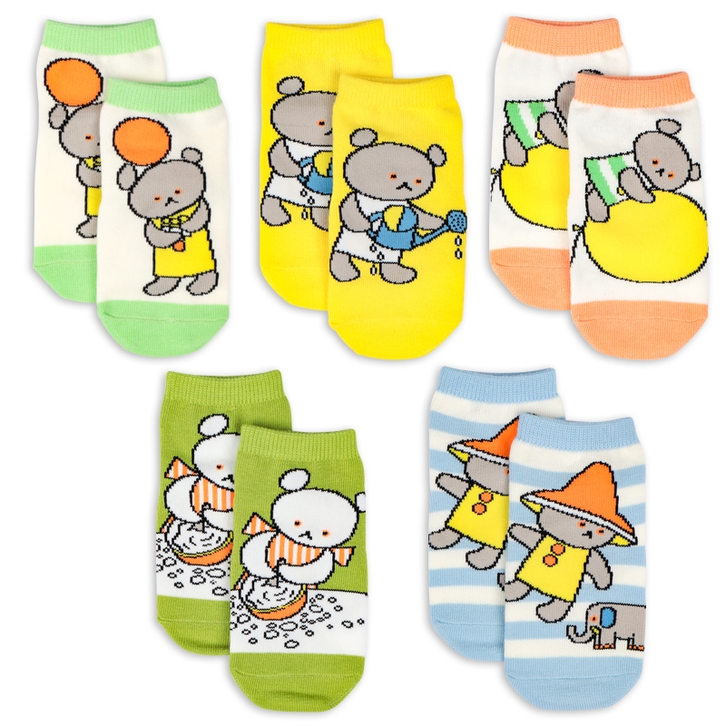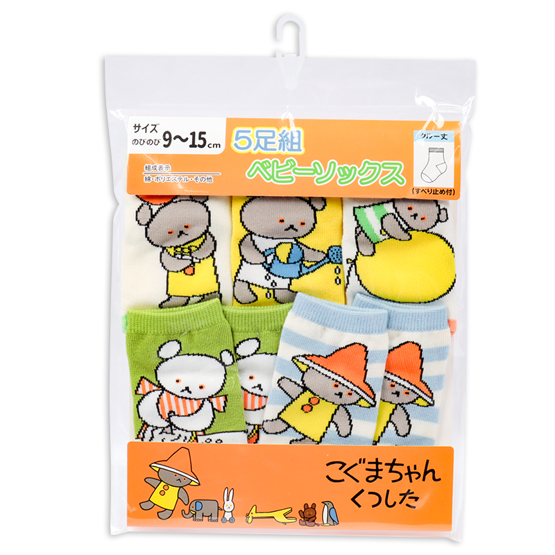 こぐまちゃんの絵柄がかわいらしい、ソックス5足組セットです。 デザインもそれぞれ違うので、コーディネイトや気分に合わせて選んで頂けます。 靴下の底に滑り止めが付いているので、屋内で走る時や屋外の遊び時に足を保護してくれます。