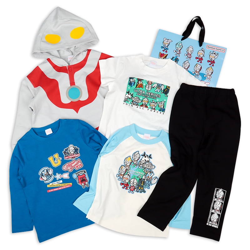★★★ご予約受付期間★★★ 11月14日(金)~12月14日(日)まで⇒12月22日(月)から順次発送 ※【予約商品】と【一般商品】の注文はできませんのでご了承ください 納期が異なる場合は納期の遅い方にあわせて出荷となります。 【商品は12月22日から順次お届けいたします】 人気のテレビ番組ウルトラマンをモチーフにデザインされたコーディネートセットです。 パーカー、ラグラン長袖Tシャツ、長袖Tシャツ、半袖Tシャツ、パンツが袋に入った5点セット。 組み合わせてコーディネートして頂けます。 ウルトラマンキャラクターと一緒に元気に楽しくお出かけしましょう。