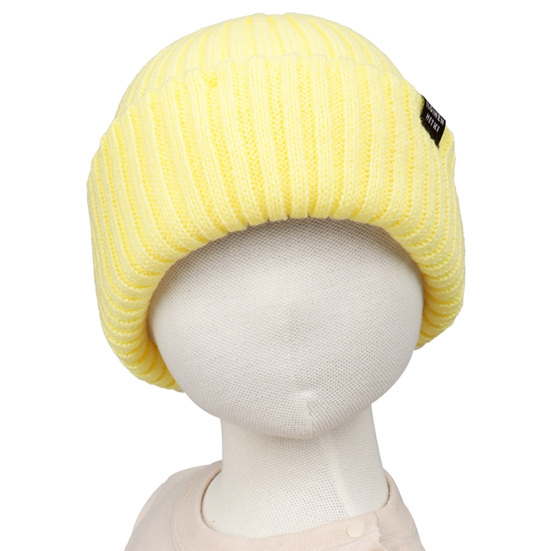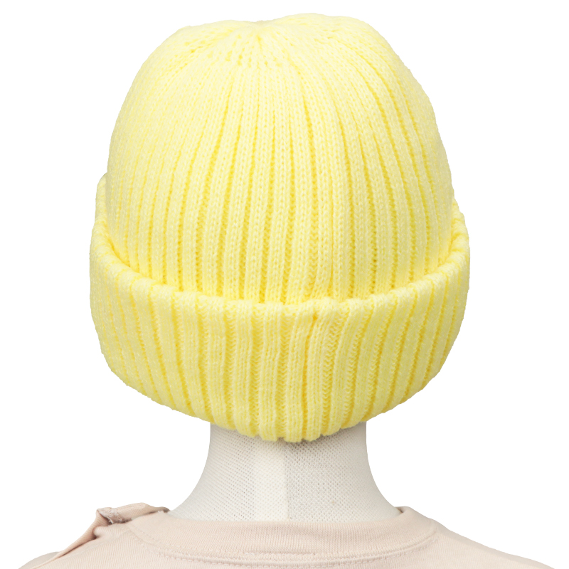 コーディネートで活躍できる、差し色カラーのアイテムです。 リブ編みで伸びがよいので、お子様に被せやすいです。 ニットは厚みのあるダブル地仕様になっています。 被り口の折り返し部分を織ネームが飾り、こなれた印象をプラスします。