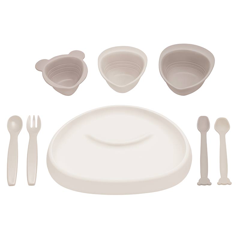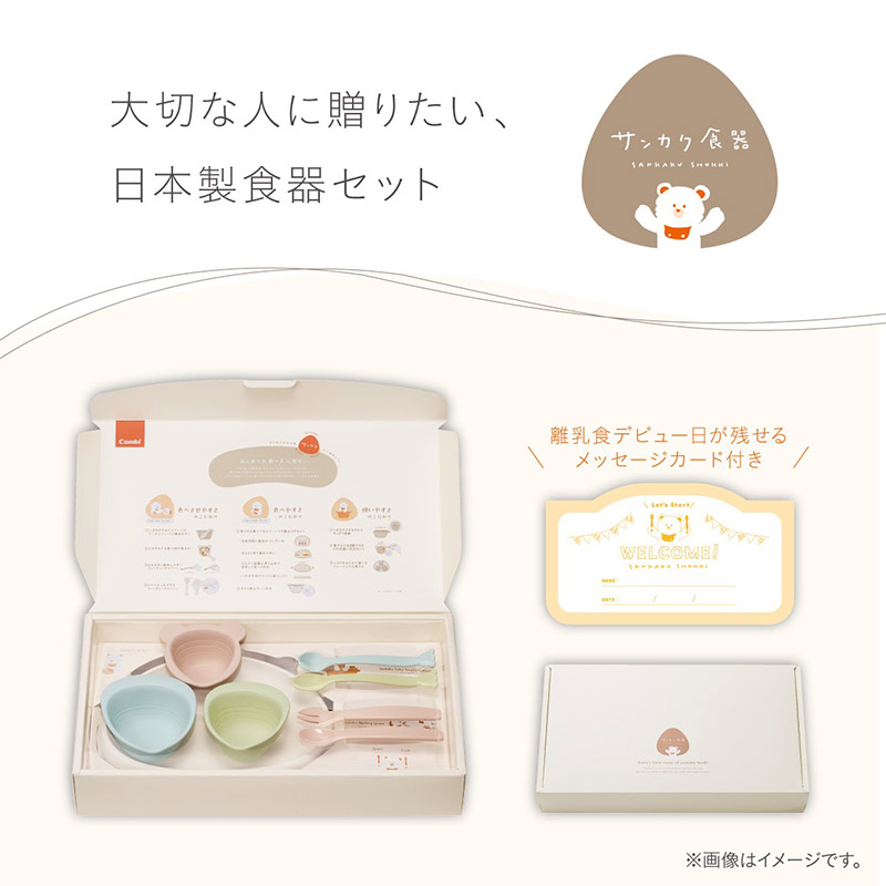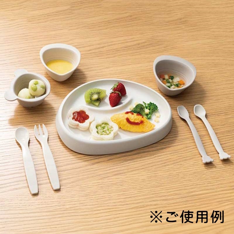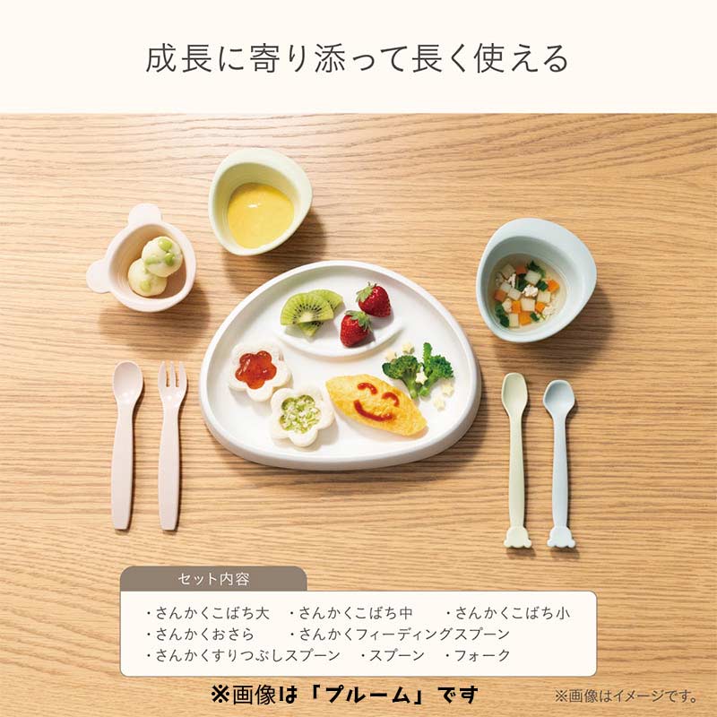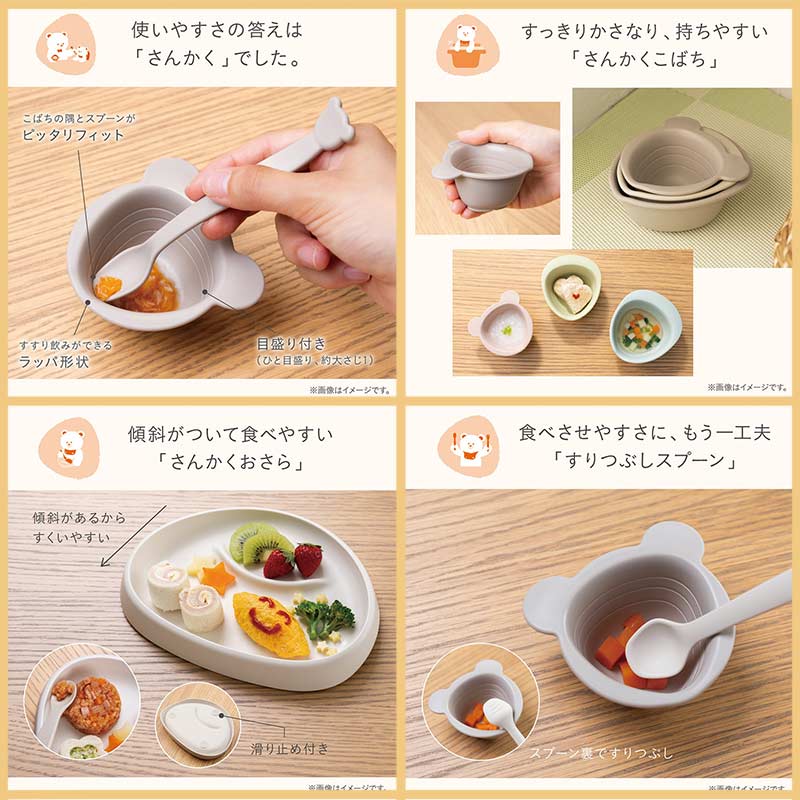 3つのこだわりを”サンカク”に込めました。 食べさせやすさのこだわり ●こばち ・こばちのすみとスプーンがぴったりフィットでかき集めやすい。 ・少量の離乳食でも、さんかく角で集めやすい。 ●フィーディングスプーン ・持ちやすく、操作しやすいフィーディングスプーン ・すりつぶしができるフィーディングスプーン たべやすさのこだわり ●こばち ・さんかくの角ですすり飲みができるラッパ形状 ●さんかくおさら ・手前方向に傾斜がついている。 ・さんかく配置のすべり止めで安定して食べられる。 つかいやすさのこだわり ●こばち ・こばちがかさなるからスッキリ収納 ・量がわかるメモリ付き(ひと目盛り 約大さじ1杯) ●さんかくおさら ・こばちをまとめて運べるトレーとしても使える。