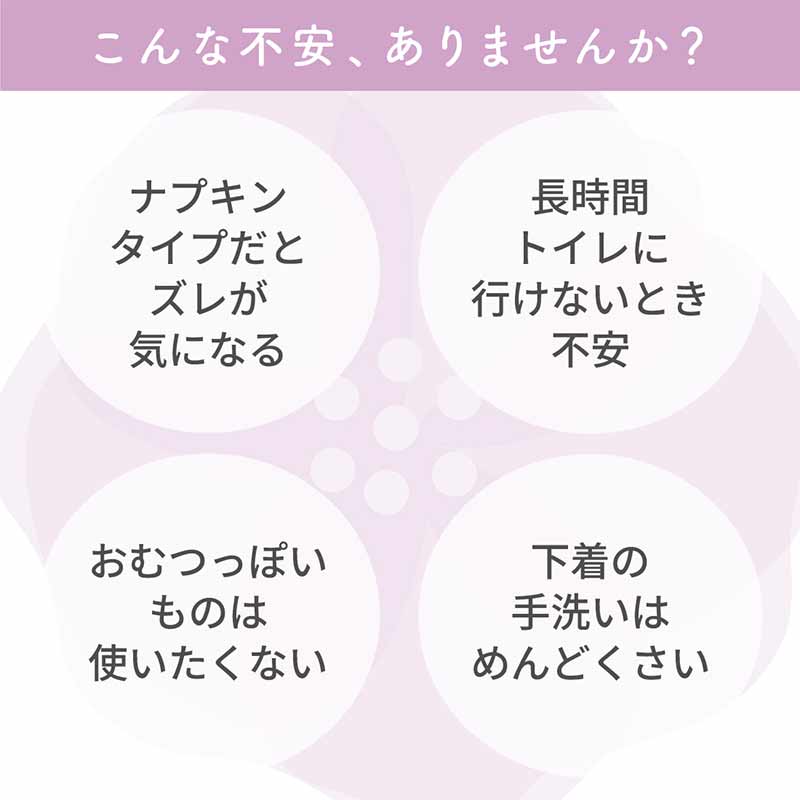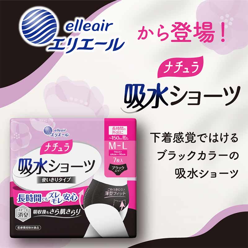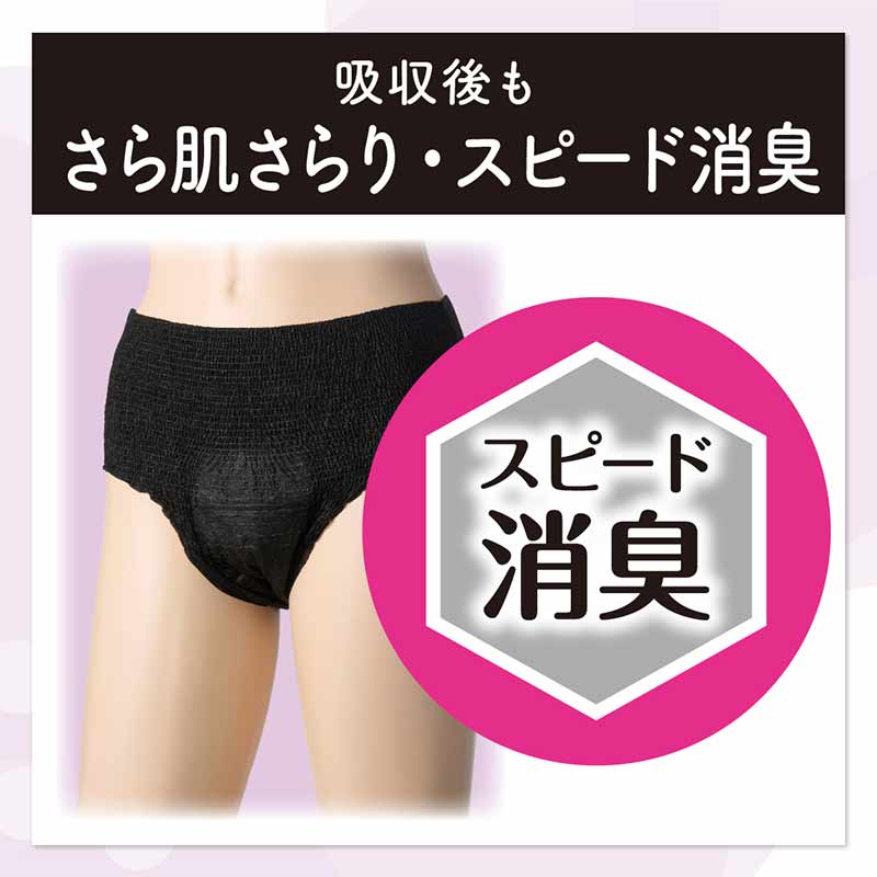 下着感覚ではけるブラックカラーの吸水ショーツ ●おしゃれなブラックカラーで使いきりタイプ。 ●ごわつきにくい薄型フィット。 ●ズレ・ヨレに強く全方位守ってくれる。 ●たっぷりポリマーでスピード消臭。 ●吸収後もさら肌さらり、スピード吸収。 ●1枚1枚袋入り個包装