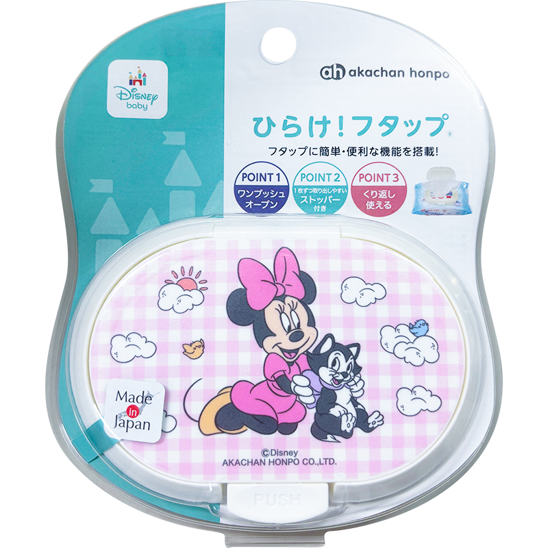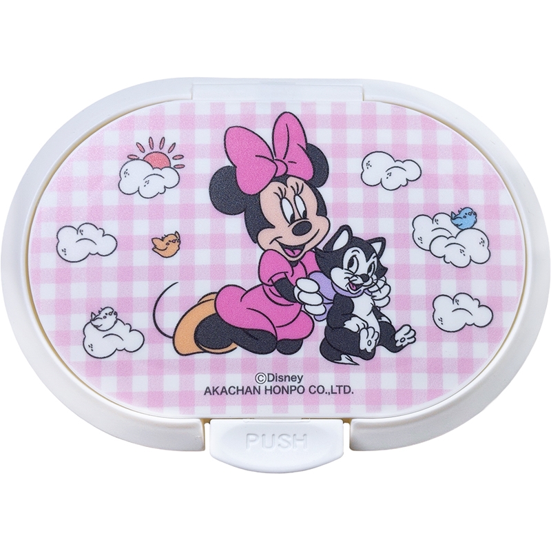 おしりふき、クリーナーシート、ウェットティッシュなどのパッケージ取り出し口に貼って使うフタです。 繰り返し付け外しができる粘着シール付きでワンプッシュで開閉できます。 取り出し口にストッパーが付いているので1枚ずつ取り出しやすい仕様です。 かわいいミニー柄です。 (c)Disney