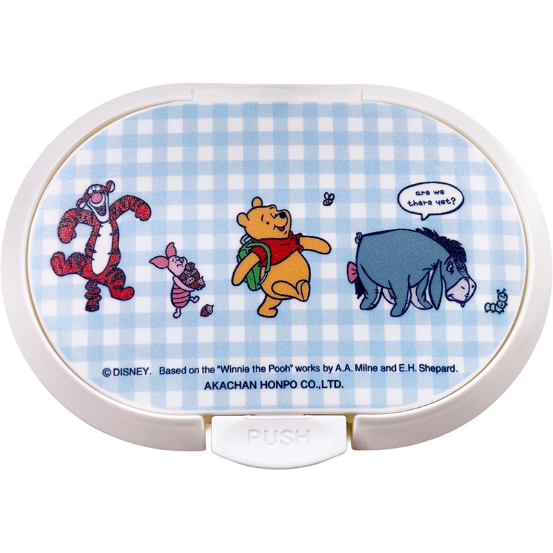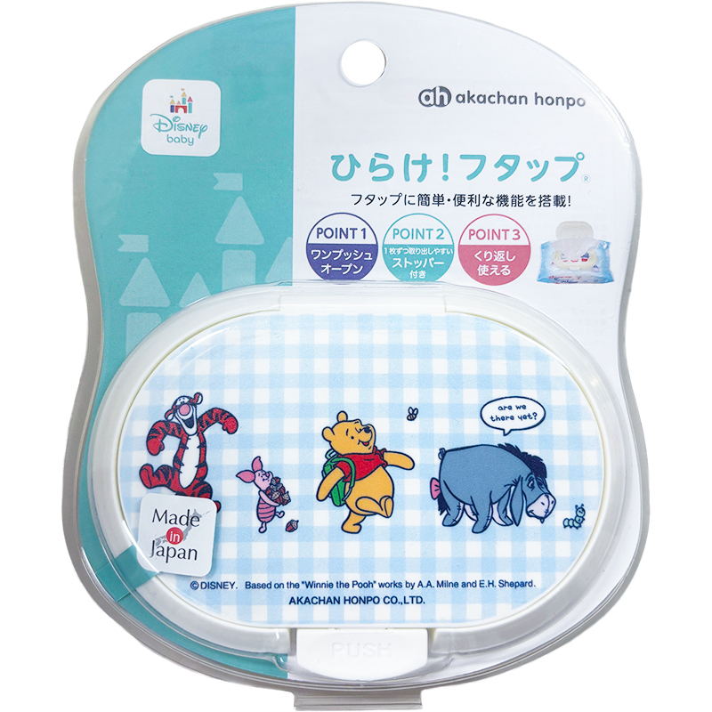 おしりふき、クリーナーシート、ウェットティッシュなどのパッケージ取り出し口に貼って使うフタです。 繰り返し付け外しができる粘着シール付きでワンプッシュで開閉できます。 取り出し口にストッパーが付いているので1枚ずつ取り出しやすい仕様です。 かわいいプーさん柄です。 (c) Disney. Based on the "Winnie the Pooh" works by A.A.milne and E.H.Shepard.