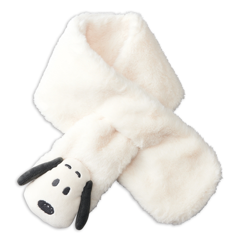 スヌーピーのモチーフがかわいらしい差し込みマフラーです。ファー使いで防寒性にも優れており、スヌーピーがお子様の首元を可愛らしく彩ります。装着の際は、マフラー部分を差込み口に通して使用します。